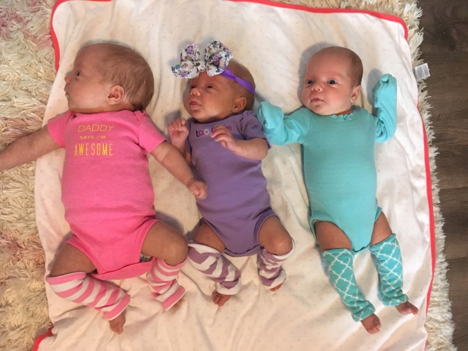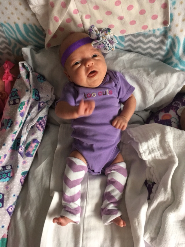 They just seem to know when Dad leaves the house, because at least one always wakes up. The first feeding took me almost 2 hours, with propping Harper (who ate like a champ), partially propping Reagan, and feeding Emerie in my lap. That two hours took a bit longer because I picked out some cute outfits, and put these fantastic leg warmers I ordered on Etsy awhile back on each of them. I now know that while Harper weighs the most, Reagan has the biggest thighs!
