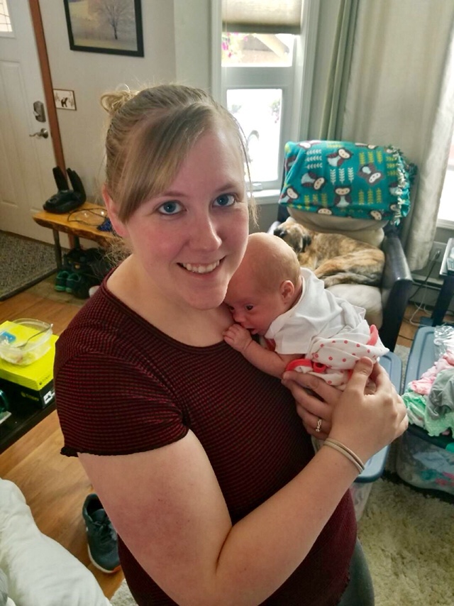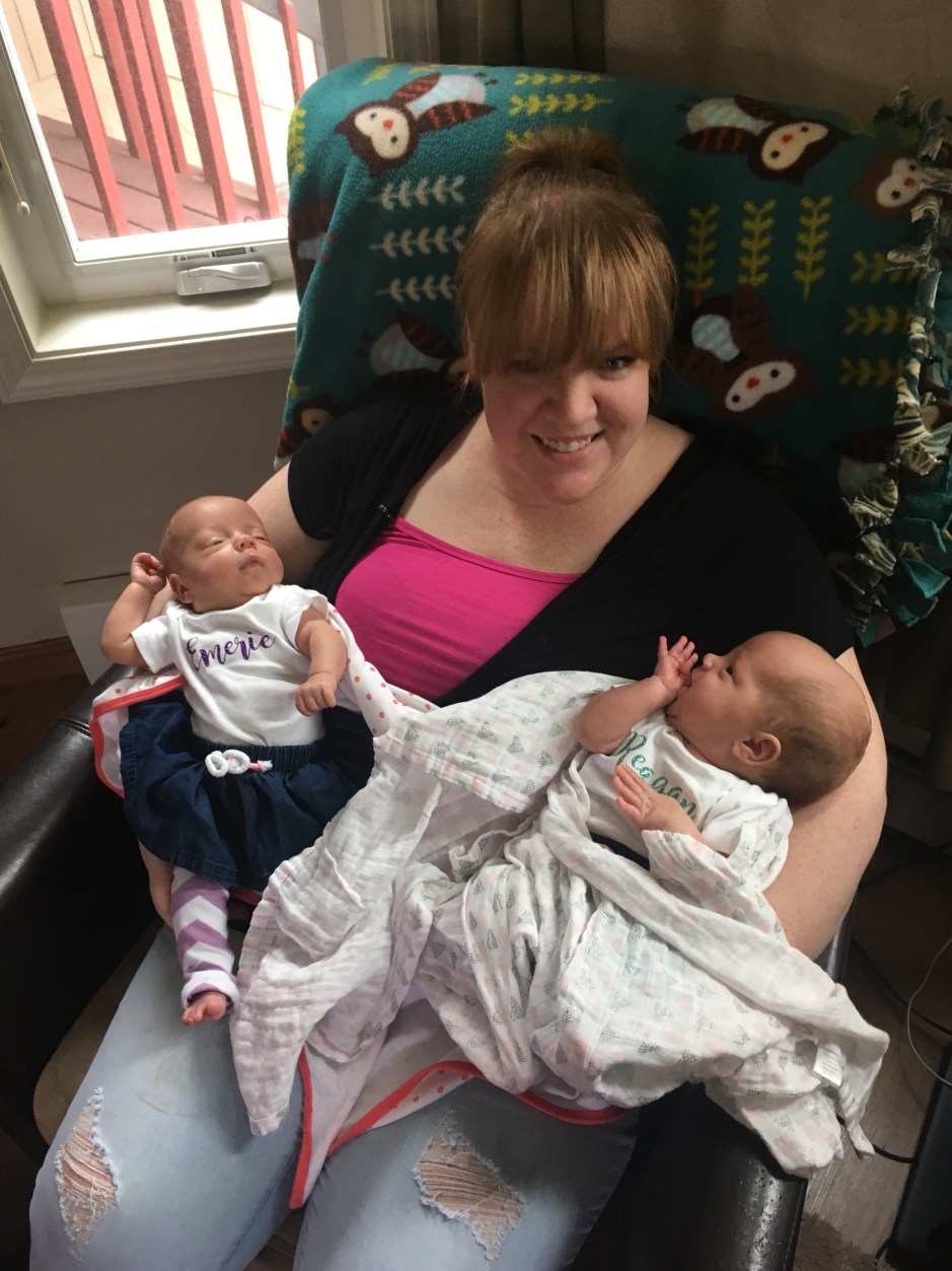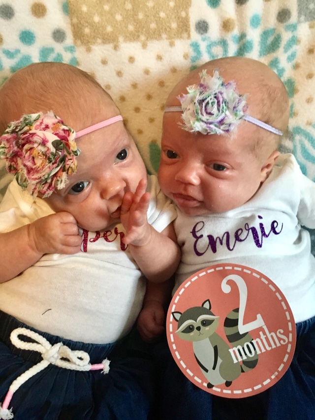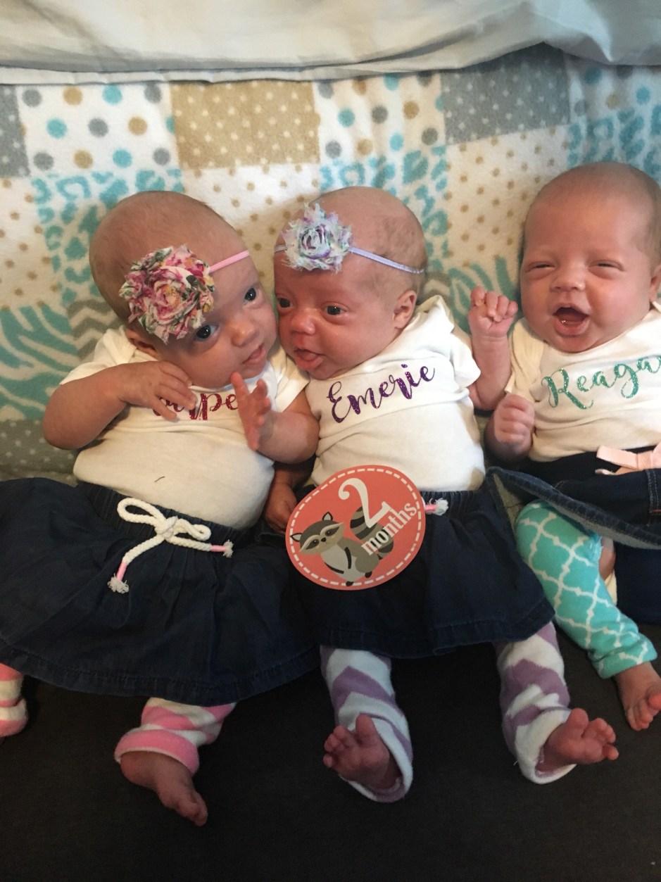 Today marks two months old for the girls. It’s been a trying day, with Emerie pretty fussy and staying awake! We dressed the girls in matching outfits for a quick photo op that Emerie did not appreciate but Reagan and Harper didn’t seem to mind. And the rest of the day was spent at home, with a visit from cousin Tyler and Aunt Janelle, so we were able to get a few things done around the house and fold some laundry while they visited. The girls are almost asleep, so we are off to bed (nap?) before the next feed.