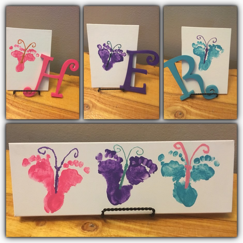 They didn’t particularly like the feeling of paint on their toes, but overall were good sports. We did individual butterflies for each of them and a group canvas as well.