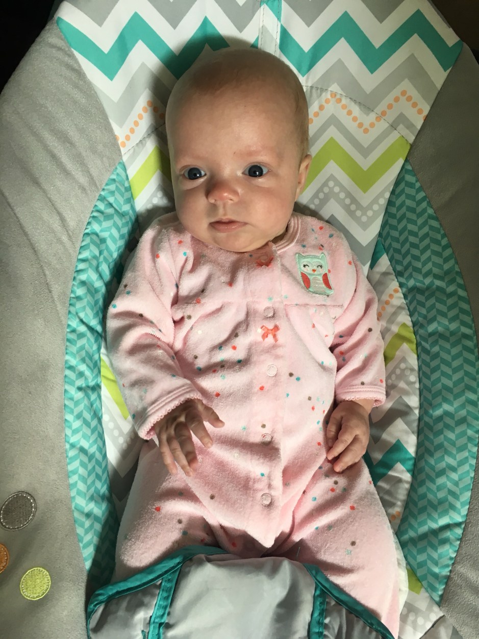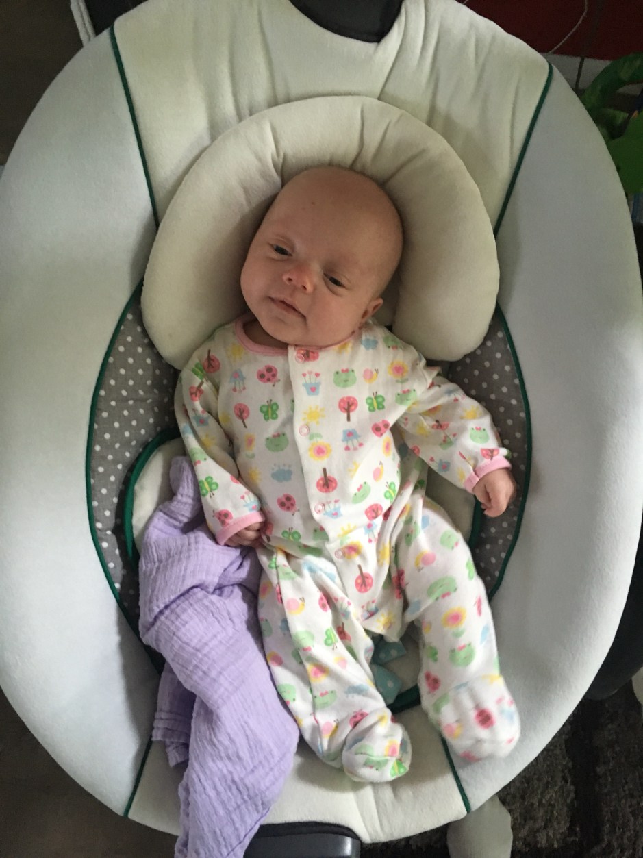 The past week was full of watching the girls learn about the world. Play time is now fun, and they like to hang out on a blanket on the floor in the living room and just look around. Everyone has improved on sitting in their rockers/swings and just looking at the world.