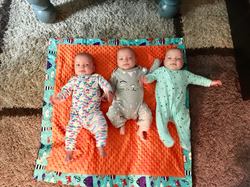 While the world is now more interesting, apparently tummy time…not so much. Reagan is still the strongest, and now uses her legs to push herself up; Harper is back to hating tummy time but doing well in general with holding up her head and doing push-ups on us; and Emerie prefers to lay there on the mat and refuse to participate entirely.