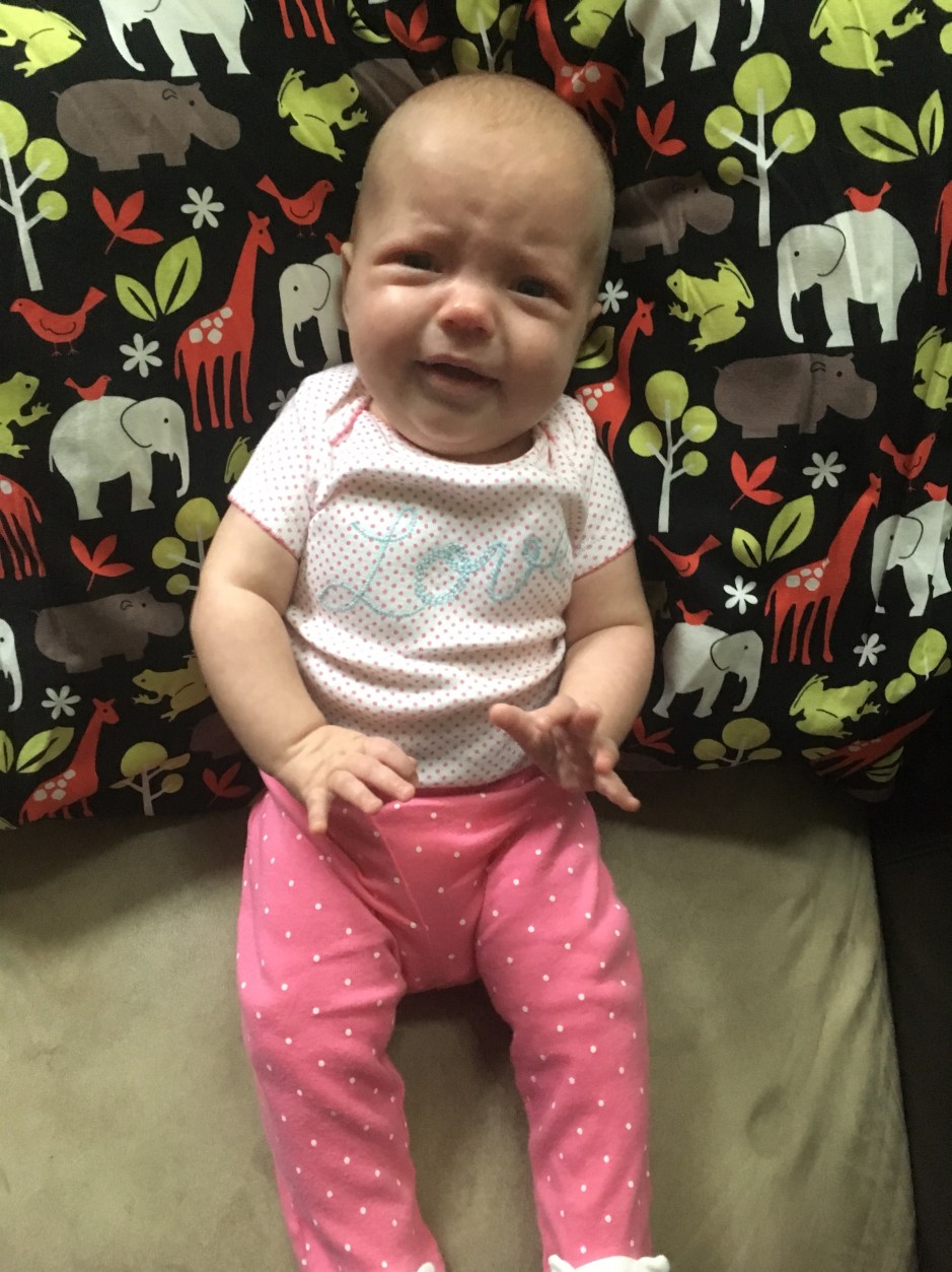 Emerie did a crazy giggle yesterday, one similar to the sneaky giggles in the movies, but she hasn’t fully done it yet. I’m sure it’s right around the corner…after four month shots…