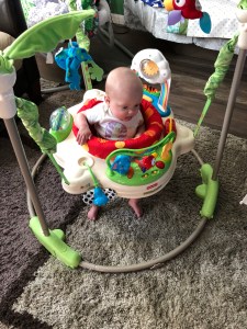 The girls are getting big! We’ve been in the fourth developmental leap (called the “world of events”) a little over two weeks now, and while there is a decent amount of crankiness and snuggle demanding, they are advancing quite significantly mentally. We decided to test out the johnny jump ups and see what the girls think now that their necks are all stronger. All three thought it was super exciting, although a little too stimulating after a couple of minutes.