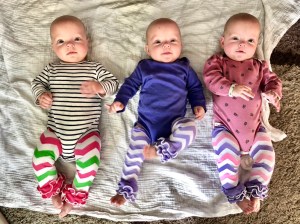 Reagan is really figuring out her hands. If I hold a toy up for her in front of her hands, she will grasp it and put it in her mouth. Such progress! Harper is starting to respond the same, and has figured out thumb chewing. Emerie won’t quite grab toys yet when I hold them out, but I did watch her reach over and forcibly pull a binky from Harper’s mouth and throw it across the pack and play…so there’s that…