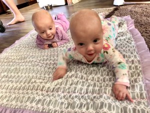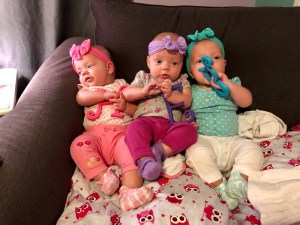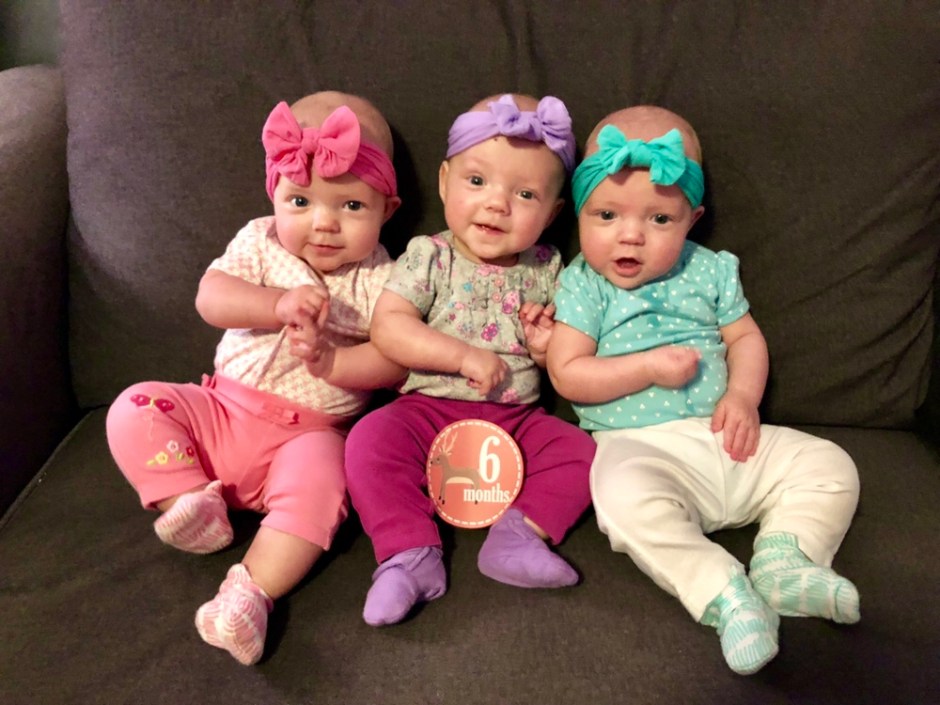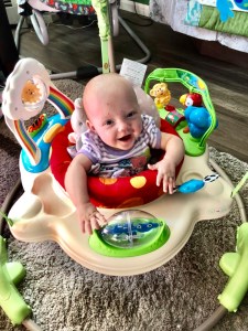 Everyone is still in halo sleep sacks at night; we figure that will continue for another month or two. We are also still tracking their feedings daily and that helps us remember how everyone is doing on things! We now have three jumpers and three sit me up chairs. And we survived six month shots; they are taking it 1000x better than their four month ones.