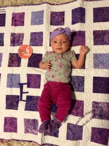 Development/Traits: Like her sisters, Reagan has figured out her hands exist, but not quite her feet. She is extremely good at grasping things held in front of her and putting them in her mouth. Reagan is our startler; loud or abrupt noises still make her jump more than her sisters do. She also remains the strongest of the three.