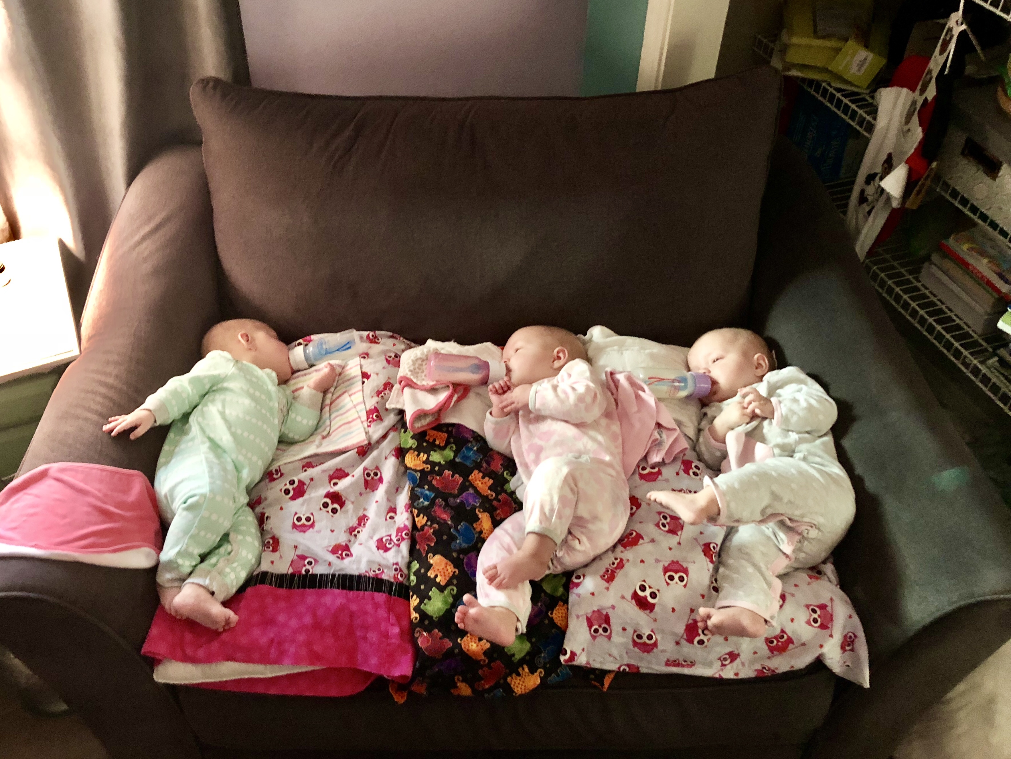 We attempted going out to eat (twice!) with everyone in tow, and it went surprisingly well. The server at Olive Garden could not quite comprehend that we had three infants, let alone that we left the house with them and attempted to eat a meal.