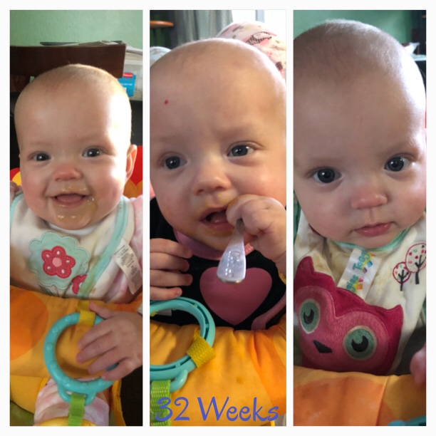 At about seven months of age, food brings lots of entertainment for all. We are still introducing it, and it doesn’t count as actual feedings yet since they are younger developmentally, but it’s rather fun to try.