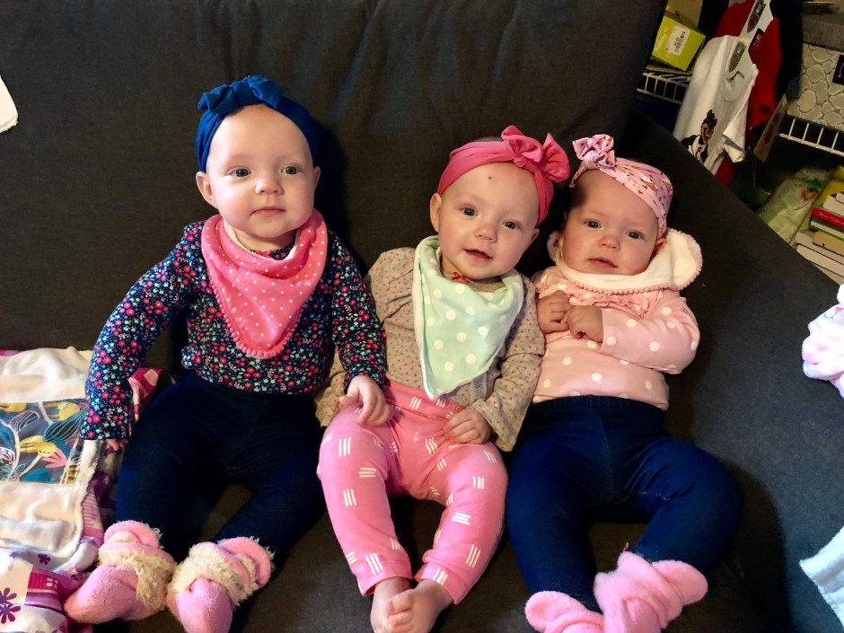 They now grab nearby toys, even when dropped, which is quite the improvement. They grab at their bottles and open their mouths when we hold them up. Emerie has mastered spoon feeding and is very demanding, while Harper and Reagan now tolerate it pretty well. I’m pretty sure they know the word “jump” and when we say it to them in their jumpers…