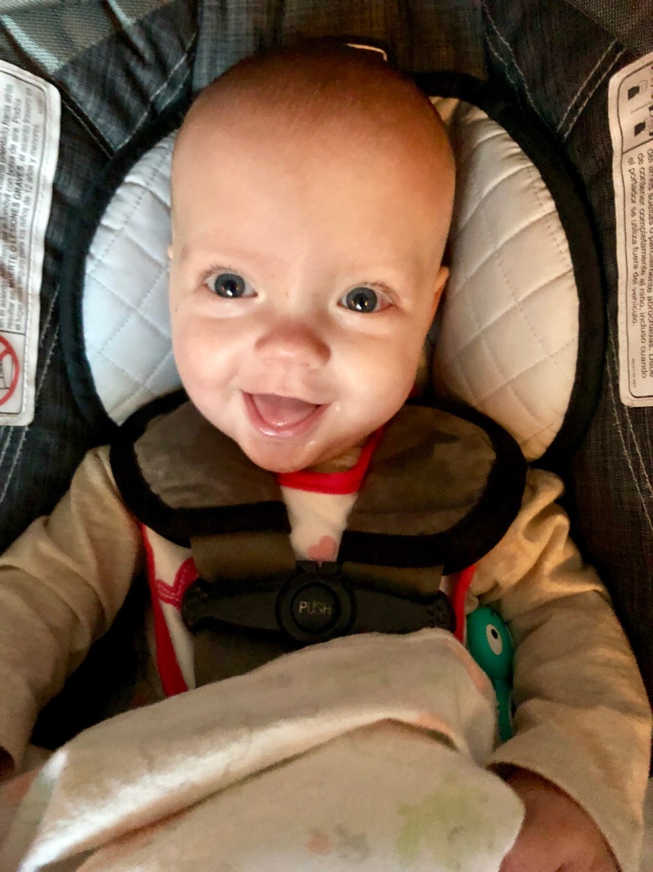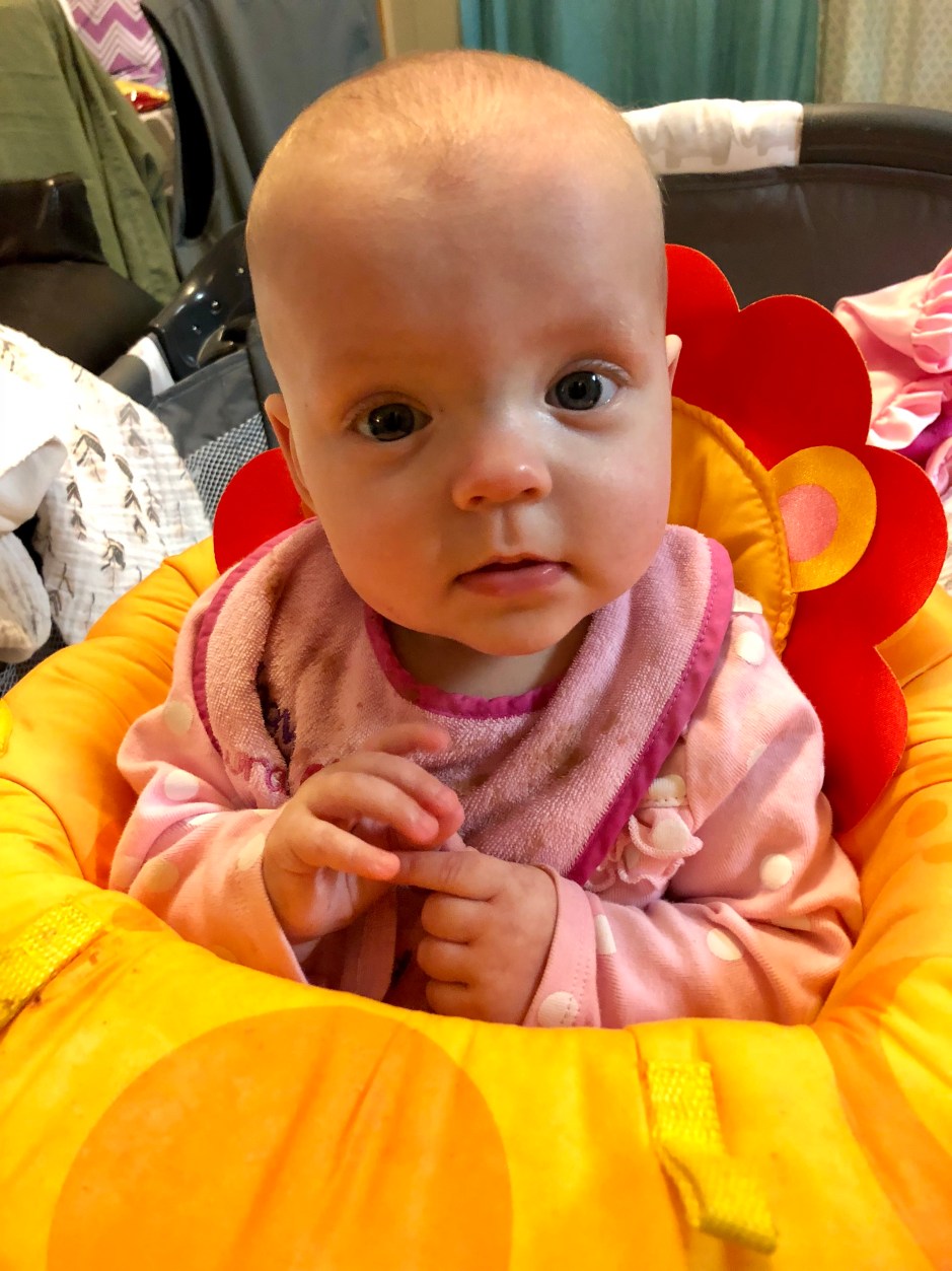 Reagan, who still has no visible teeth or a bump on her forehead, is very over having a cold, but still learning new things everyday. She believes anything you are holding should be hers to chew on, and is very interested in everything.