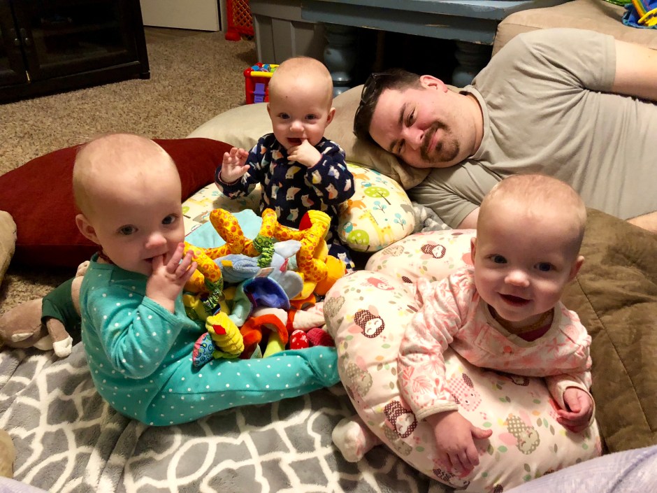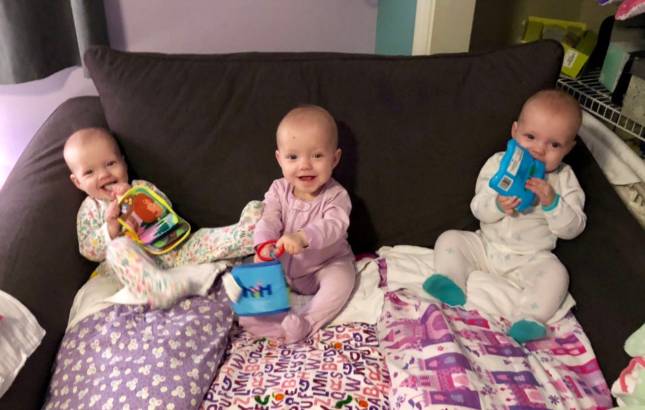 They also look ADORABLE when sleeping with their arms out. I think Harper might end up being a tummy sleeper (as long as she doesn’t realize it is like tummy time haha). Reagan is now our best sleeper and Emerie is still a work in progress but does go to sleep eventually!