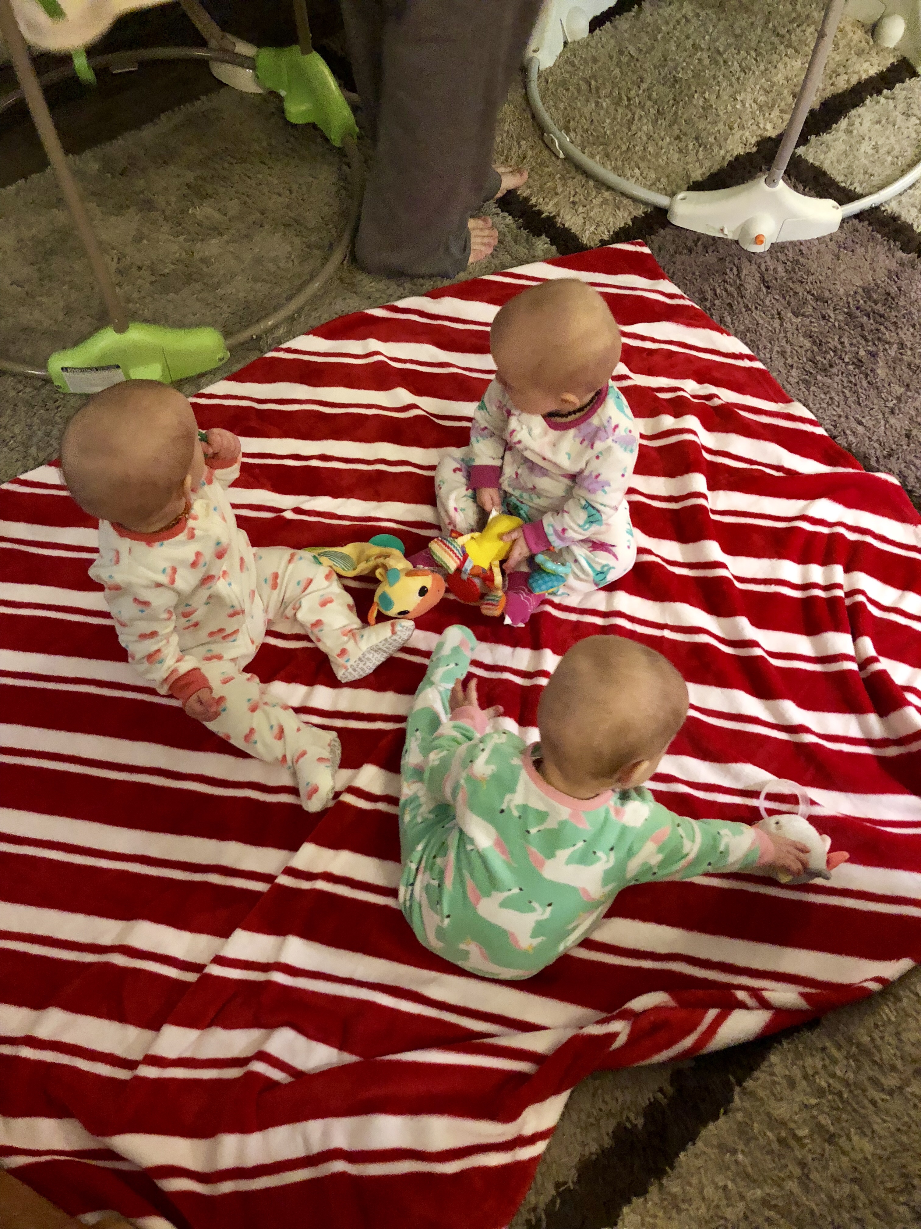 Who rolls over the most? Lately Emerie rolls the most, but generally that is due to her hatred of tummy time. Otherwise it is Reagan!