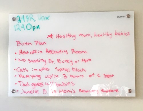 Craig headed off to the NICU with the babies as planned, and I was stitched up and moved into recovery. At this point my high blood pressure indicated eclampsia was an issue. My memory is a bit blurry here, but I do remember that I was arguing against a magnesium drip and on the line of getting it whether I wanted to or not. My blood pressure was checked every five minutes and took over an hour to come down. I didn’t get to see the girls until about 8 PM, partially due to shift change and partially due to my blood pressure issues.