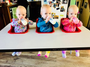 We are transitioning from bottle feeds to food intake pretty well. The girls get breakfast, lunch, and dinner each day in the triple table, with a bottle in the morning, afternoon, and right before bedtime. Everyone has three or more teeth coming through, which greatly minimized the amount of milk everyone drinks. For a few days I was bagging a bunch for later this year because they weren’t drinking it. Once the teeth popped through the gums, everyone started drinking their bottles better.