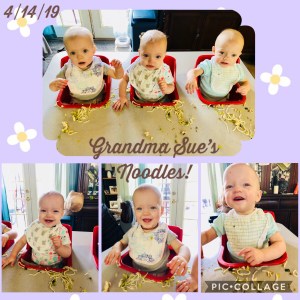 We are still working on food. The girls love to give Grandma Sue a hard time about her cooking, refusing to try things or eat them. Harper is really a stickler for refusing to enjoy her concoctions, Emerie and Reagan are more easily coaxed. They do, however, all like her chicken noodle soup, vegetables and all! Watching them slurp noodles is literally THE cutest thing.