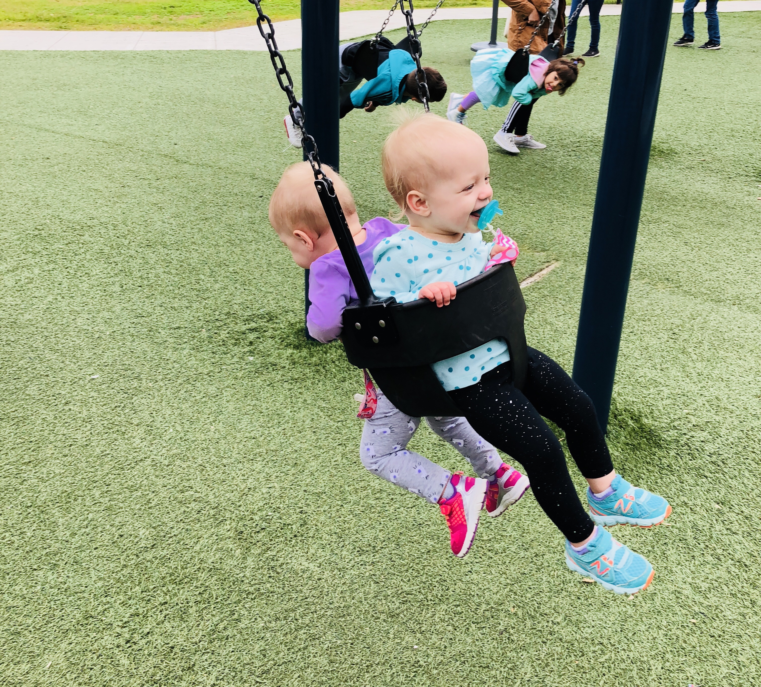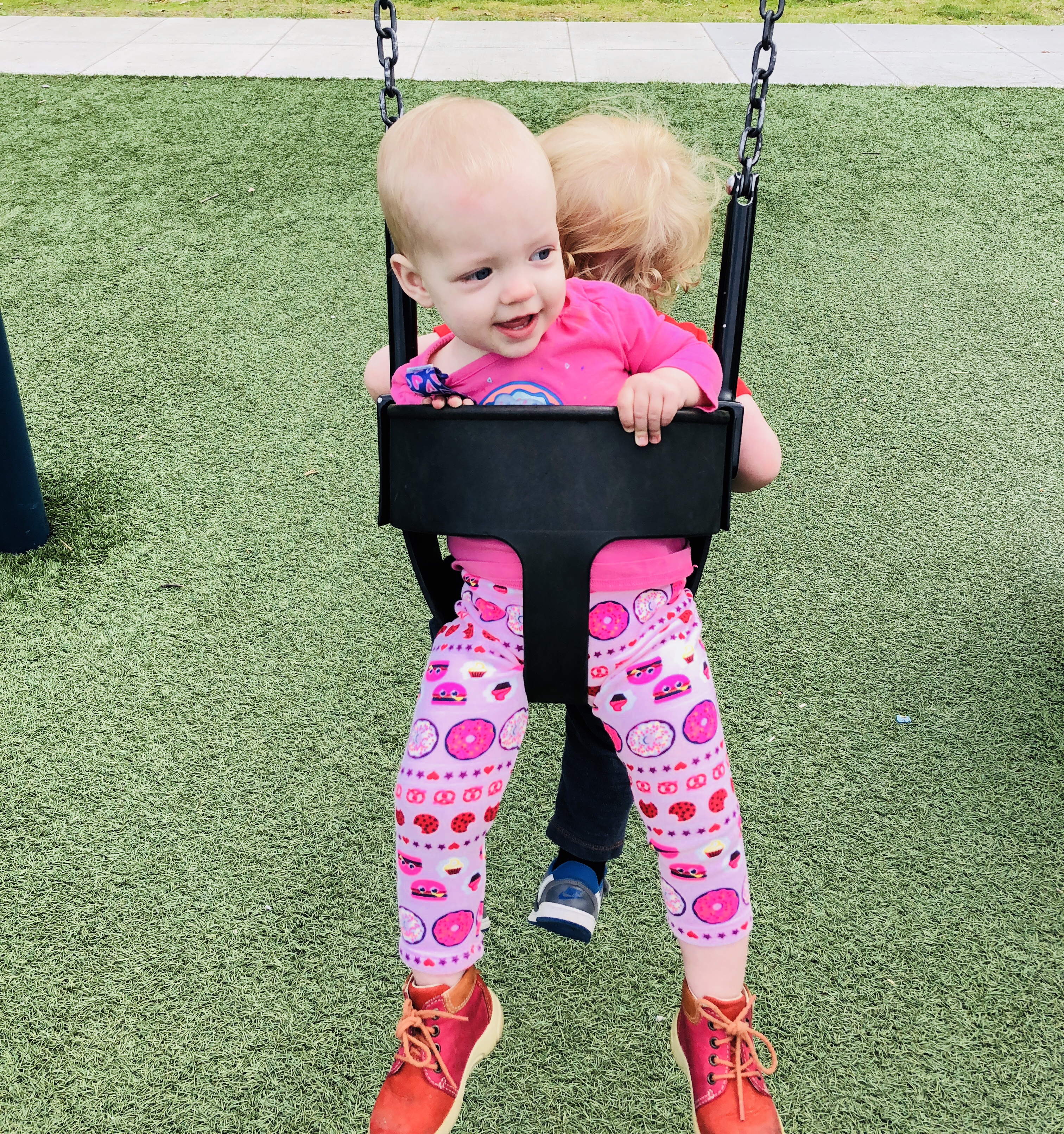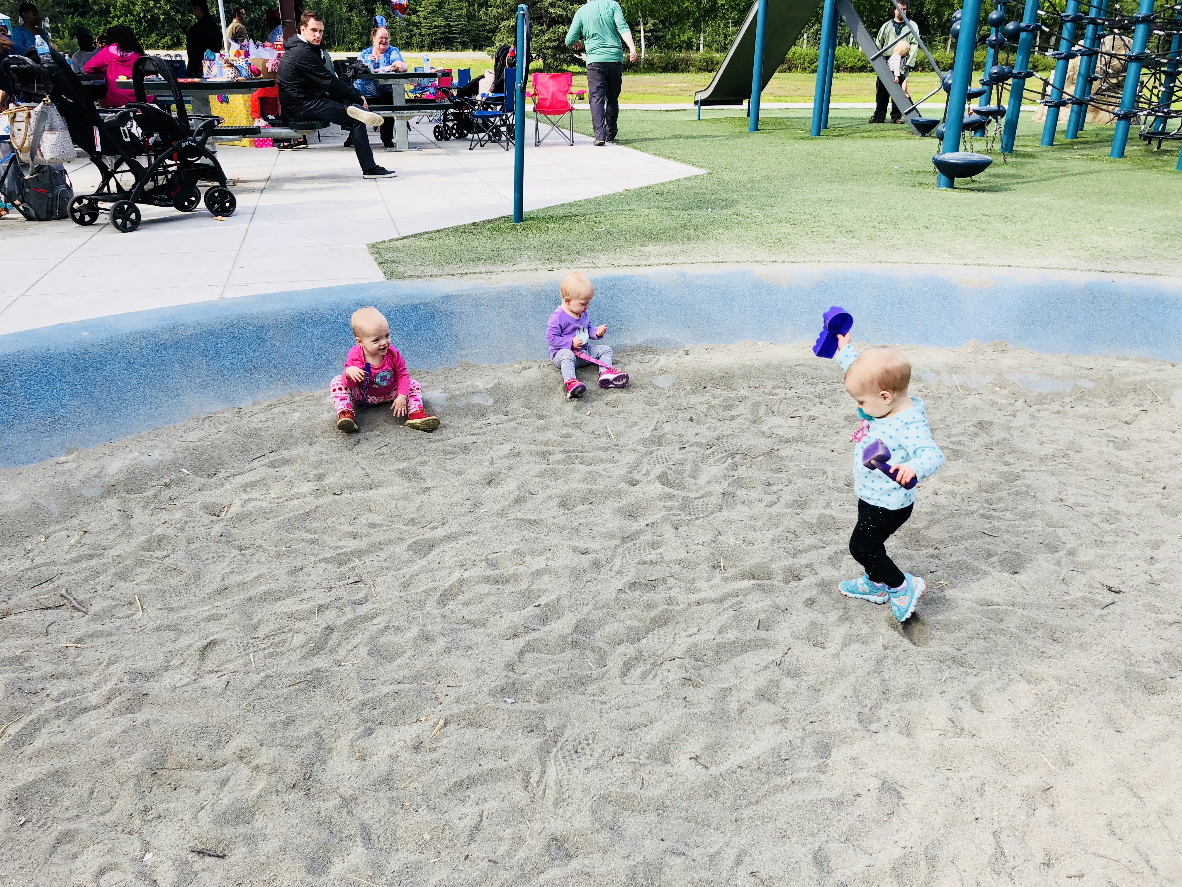 The girls did pretty well, giggling on the swings and exploring the park and the huge sandbox. William and Craig took turns taking them down the slides, which was not met with giggles, smiles, or rage- just no reaction at all! Everyone played in the sandbox and surprisingly, didn’t eat the sand! We had one baby bonk with Emerie getting a mouthful of sand, but other than that it went fine.