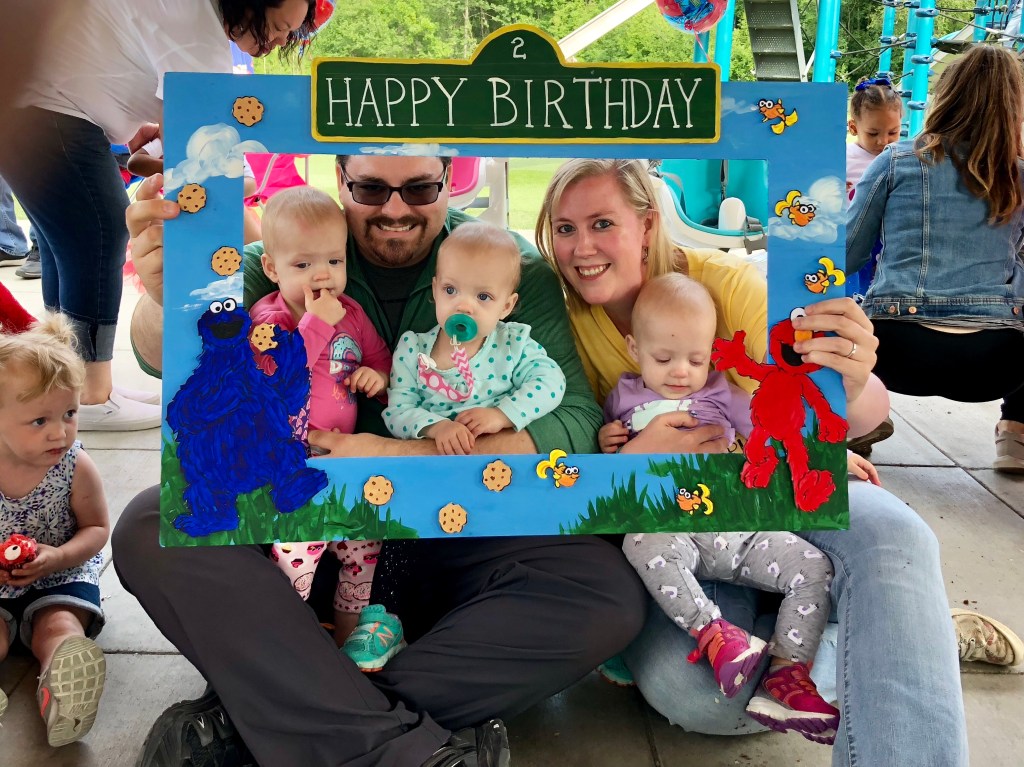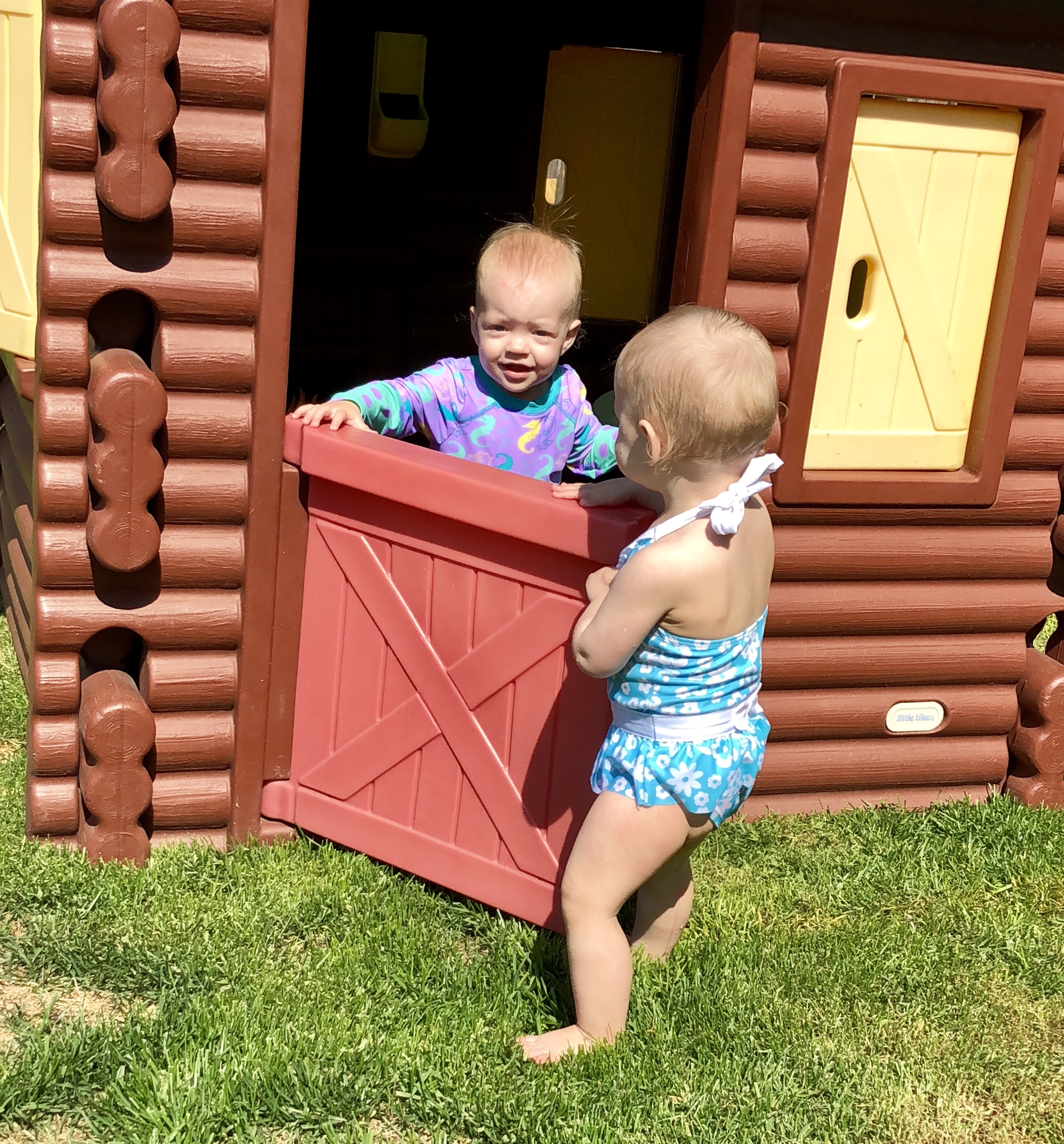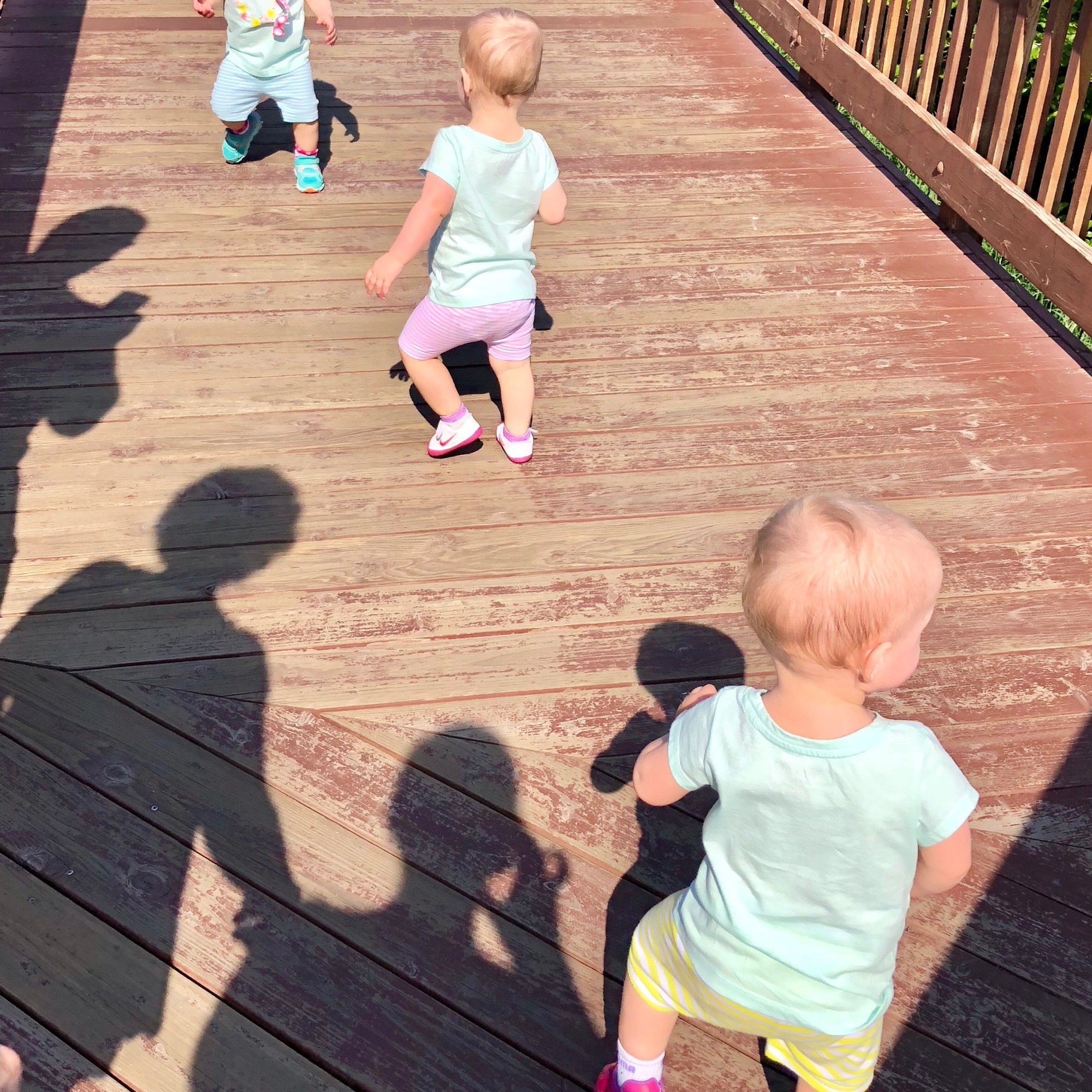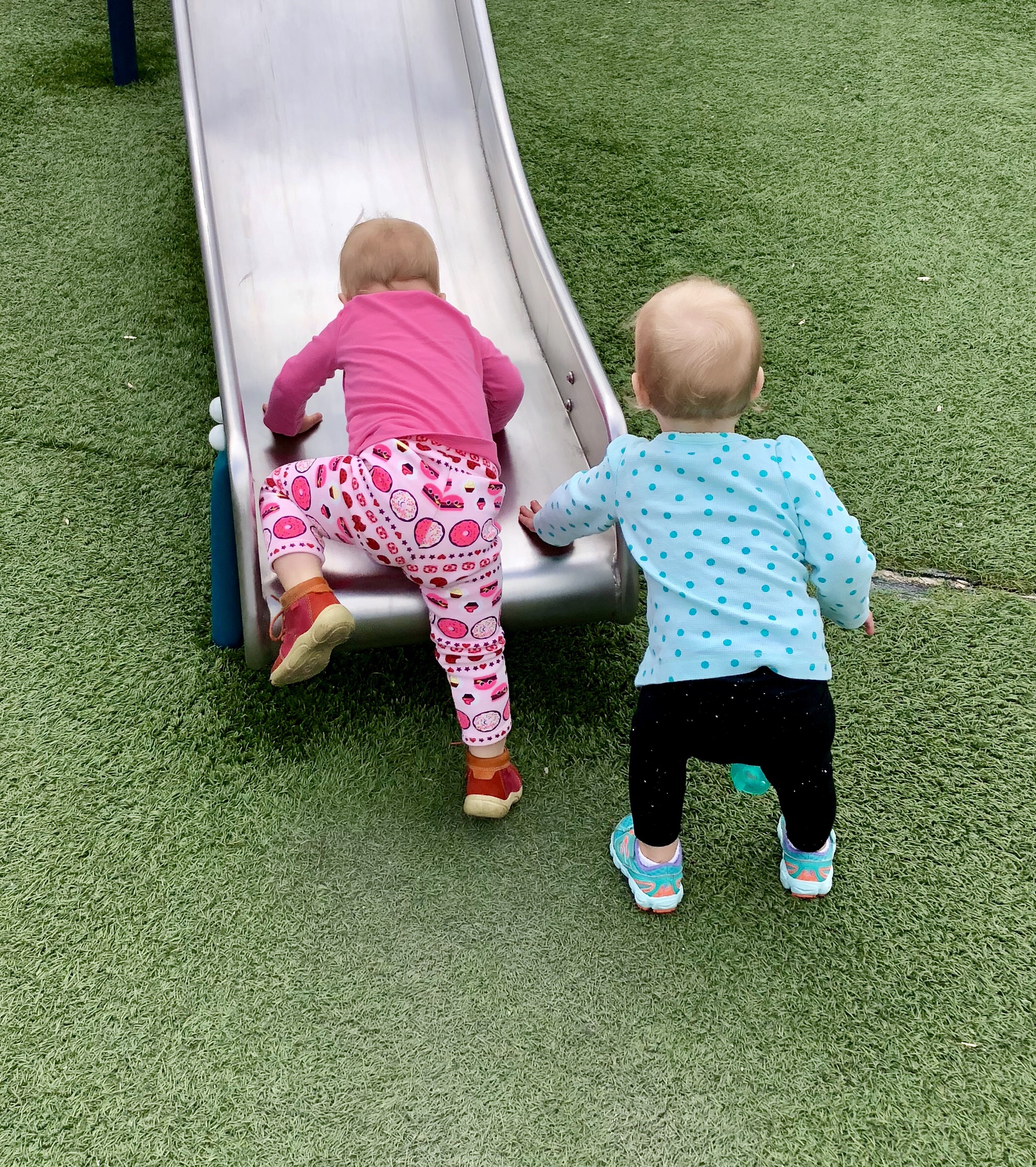 The girls did pretty well, giggling on the swings and exploring the park and the huge sandbox. William and Craig took turns taking them down the slides, which was not met with giggles, smiles, or rage- just no reaction at all! Everyone played in the sandbox and surprisingly, didn’t eat the sand! We had one baby bonk with Emerie getting a mouthful of sand, but other than that it went fine.