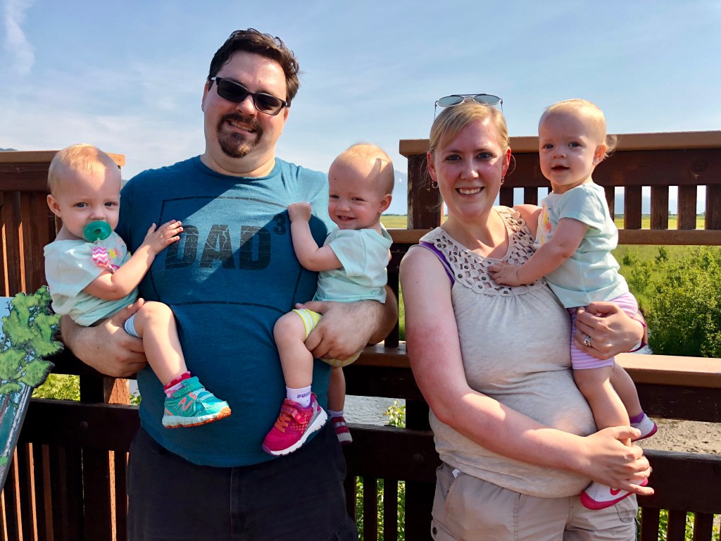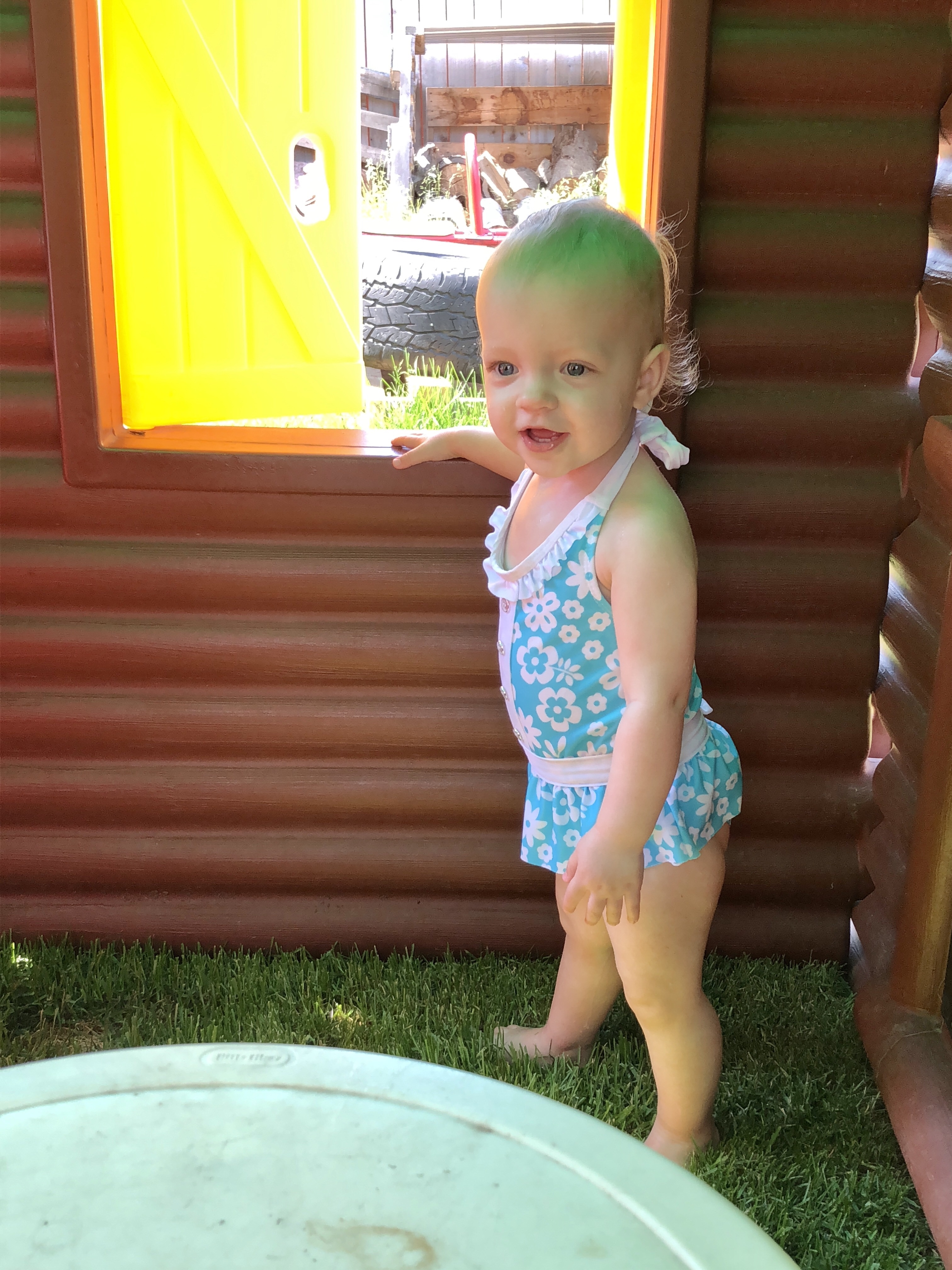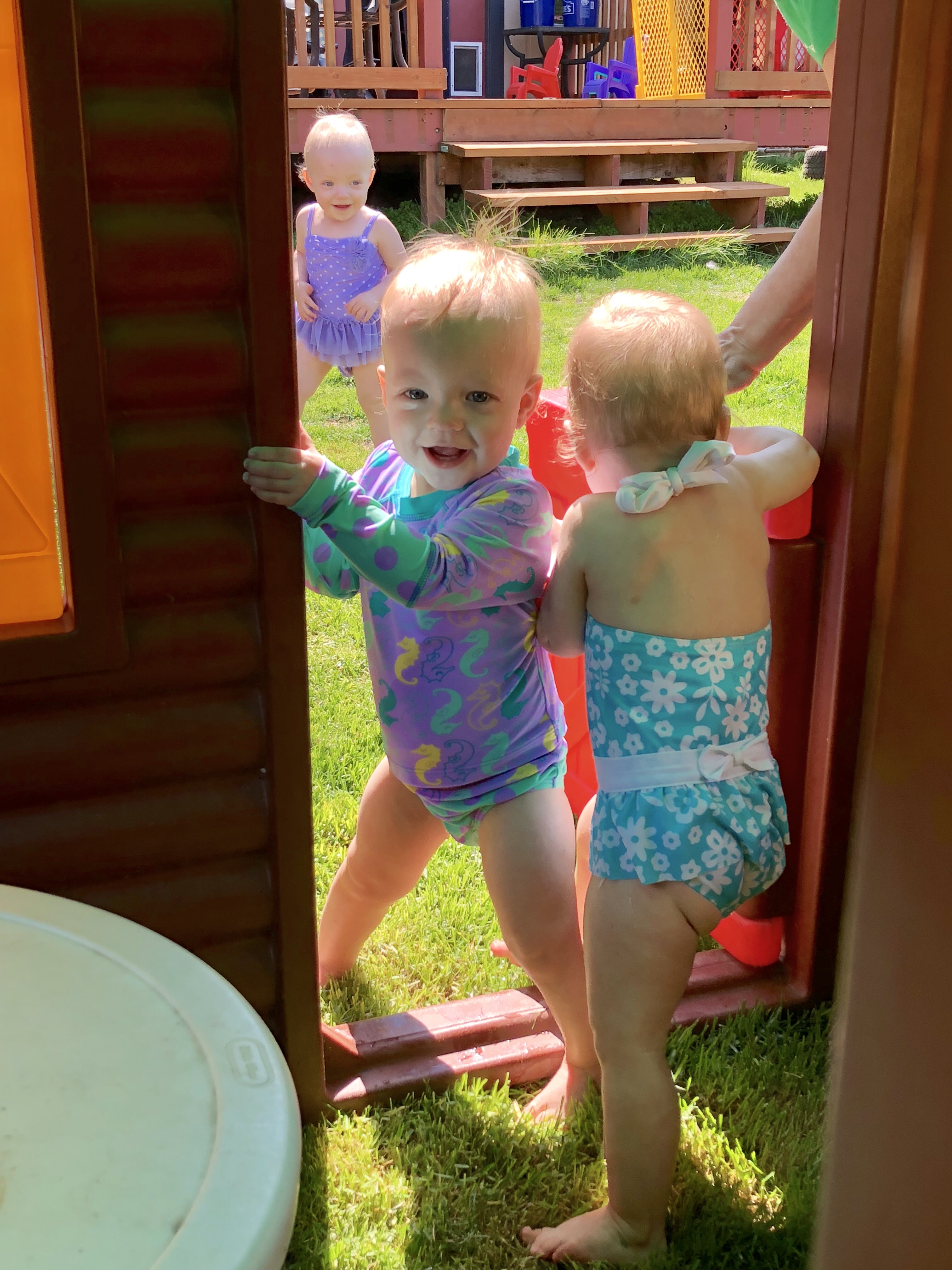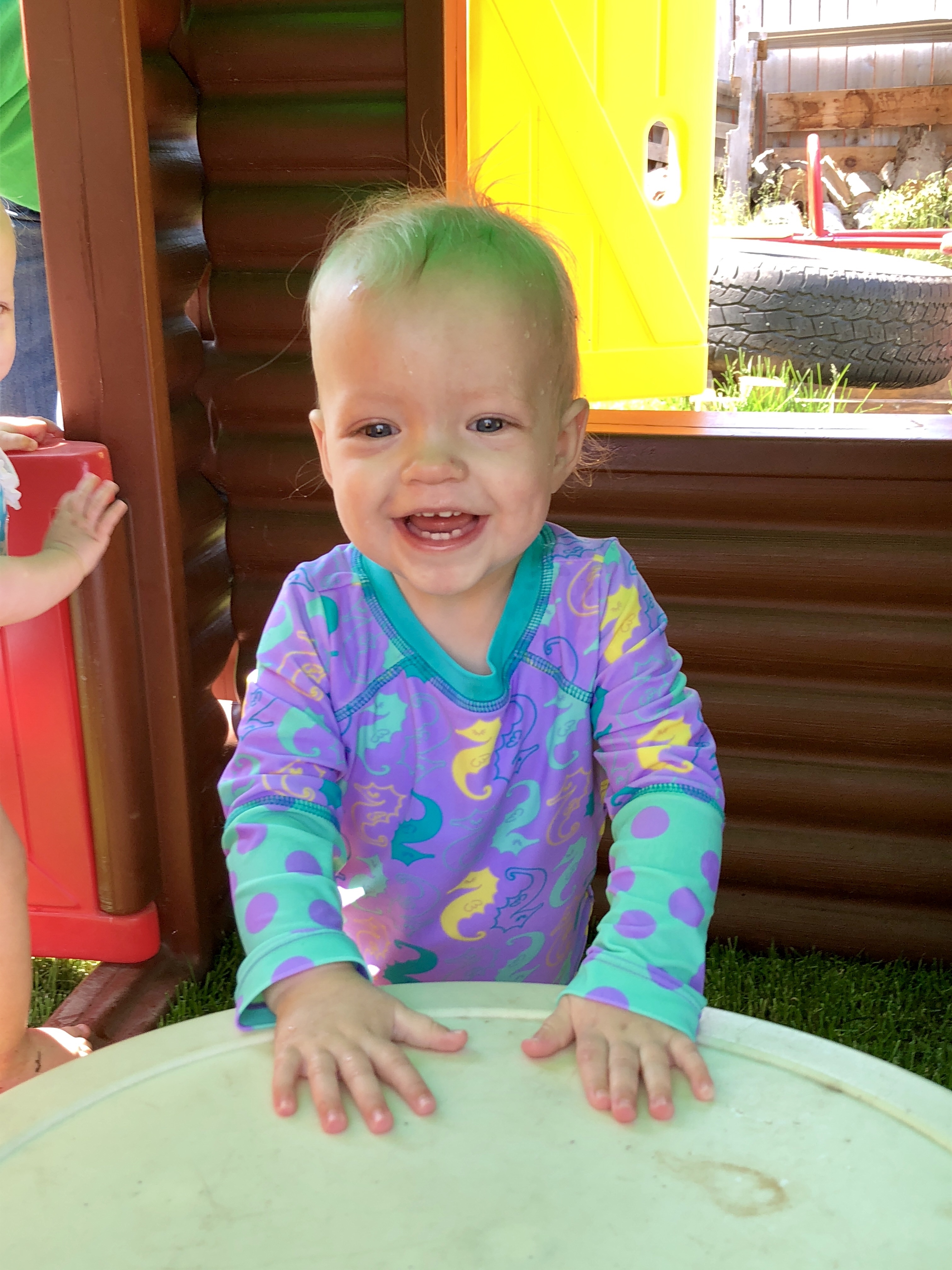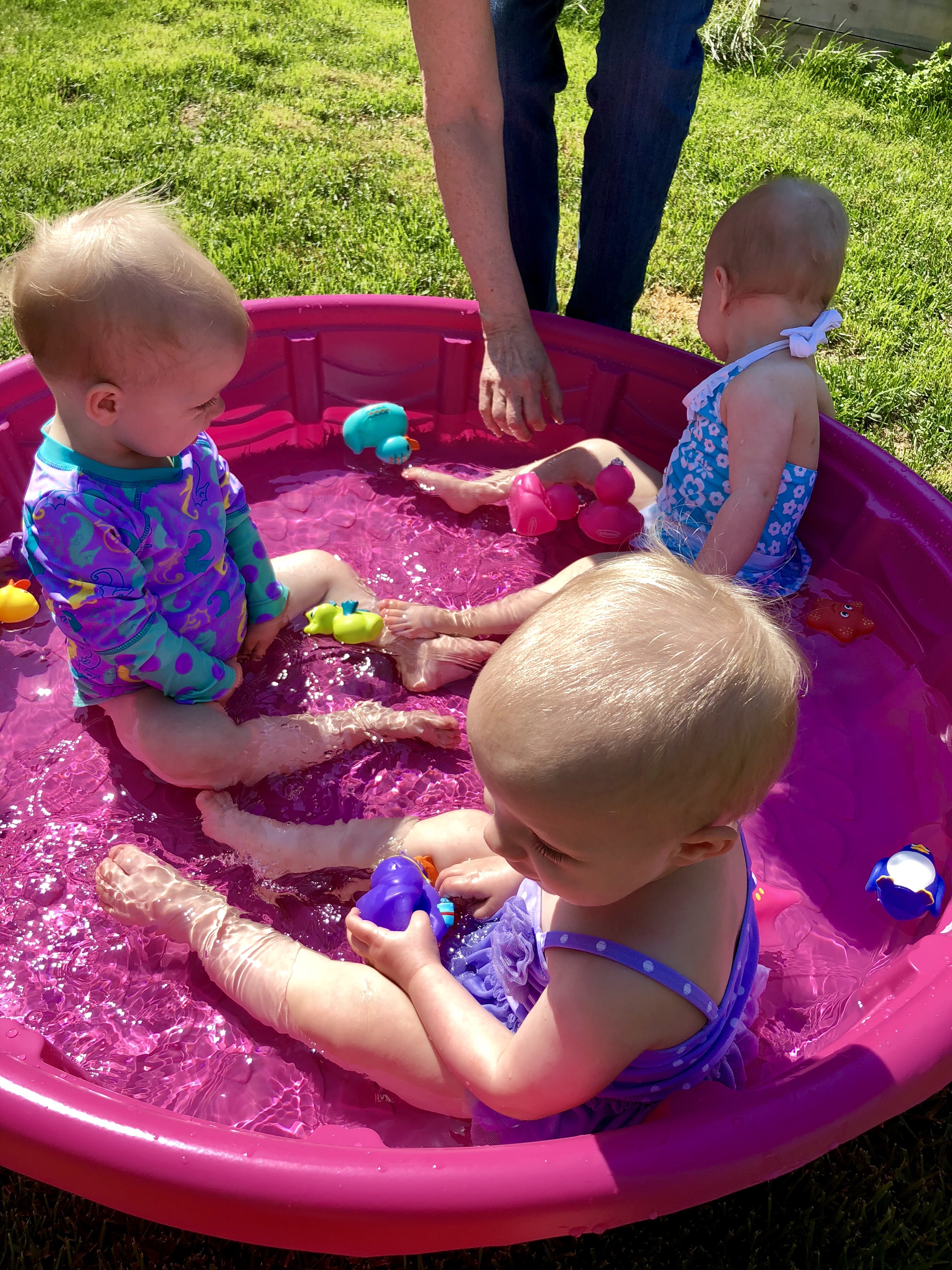 The gorgeous weekend continued through Sunday. We are starting to get a bit daring on the outside adventures, so we broke out the swimsuits, water table AND the mini swimming pool. While the girls are definitely water babies and love bath time, we opted to fill the pool with warm water from the bathroom faucet instead of the freezing hose water. With the sun shining it stayed quite warm and pleasant and no one shivered at all. Give it another year and these Alaskan triplets will love the freezing cold hose water.