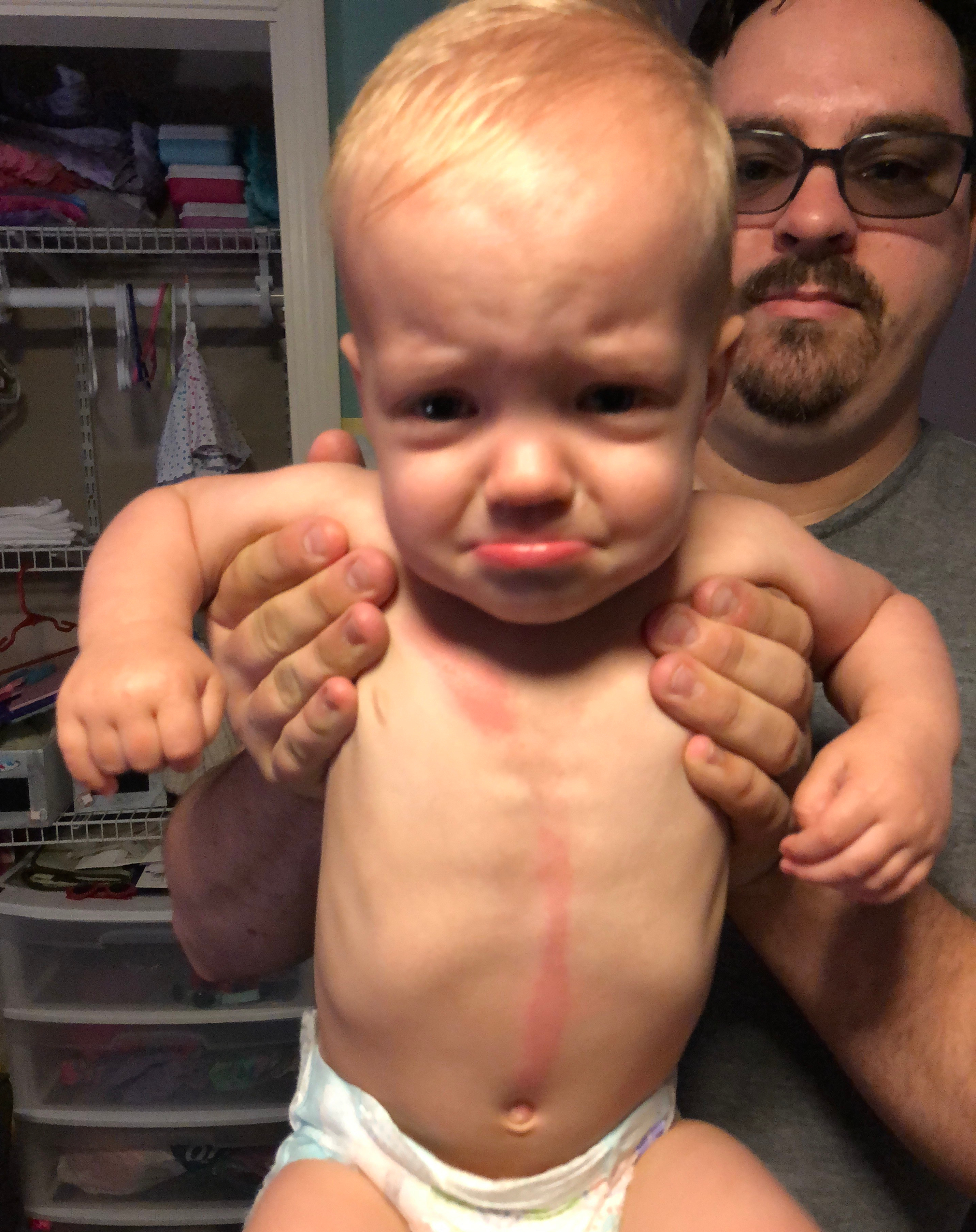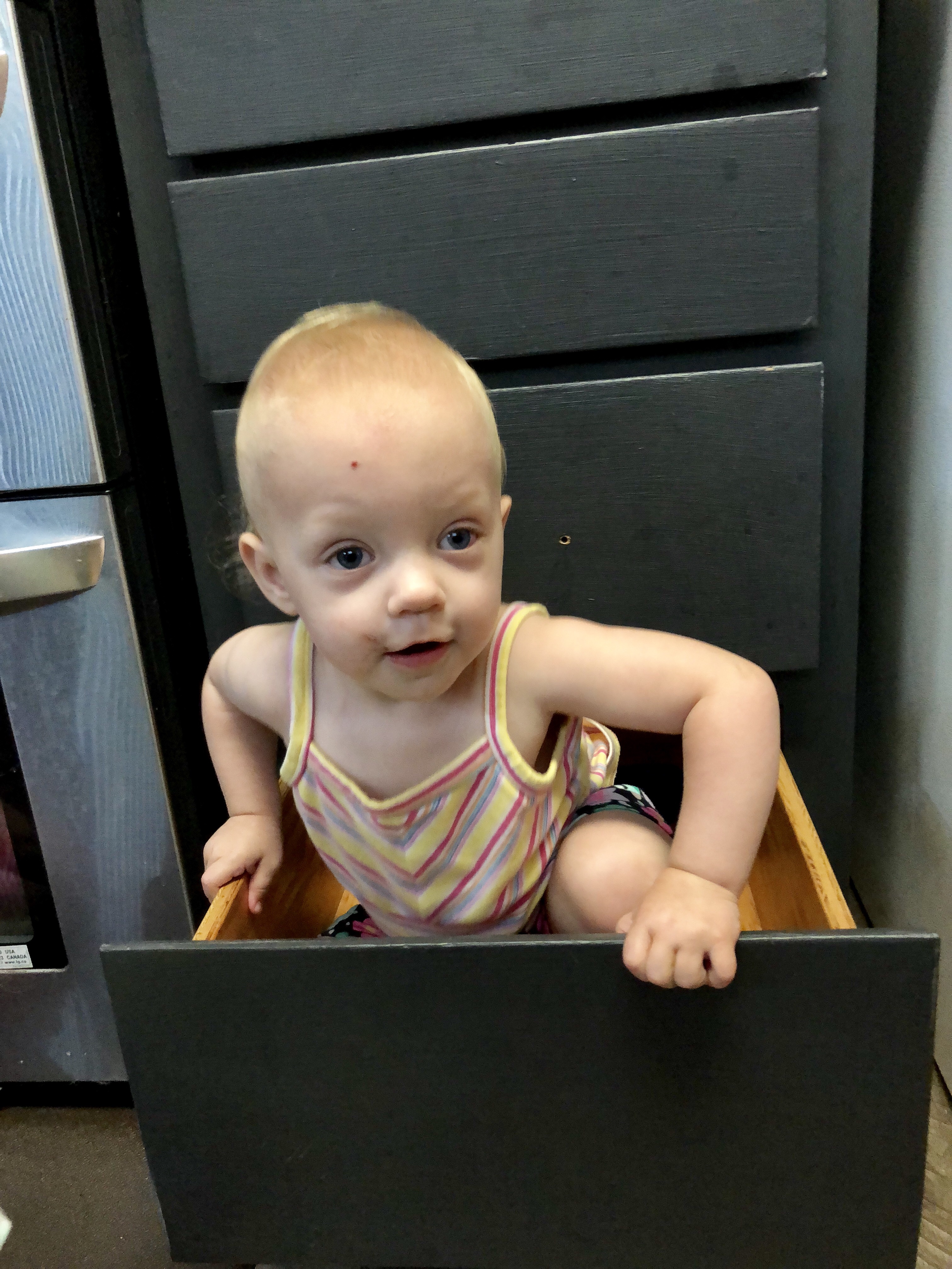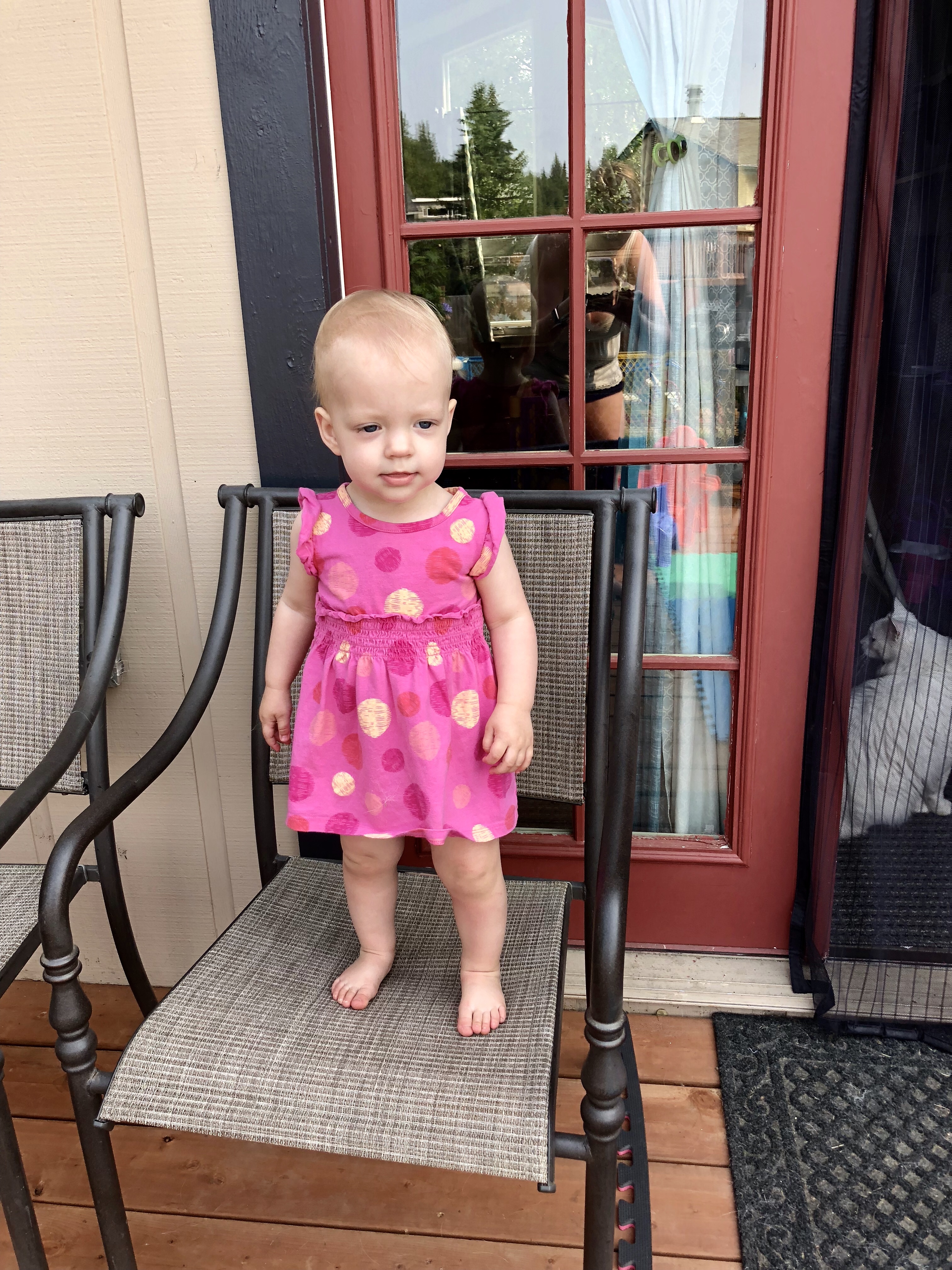 Harper has a tea drip stain down her chest, with the top portion blistering a little and the run to her belly button nearly gone. In terms of her fearlessness, she climbed the deck chair and made it onto the table (you know, in the 10 seconds we weren’t looking), picked up the cup of hot tea, and proceeded to pour that straight down on herself. While she was definitely less than thrilled at that, I’m not sure how much of a lesson she learned from it or if it’ll take a few more painful things to teach her to be more careful. Surprisingly she doesn’t have a forehead bonk right now either!