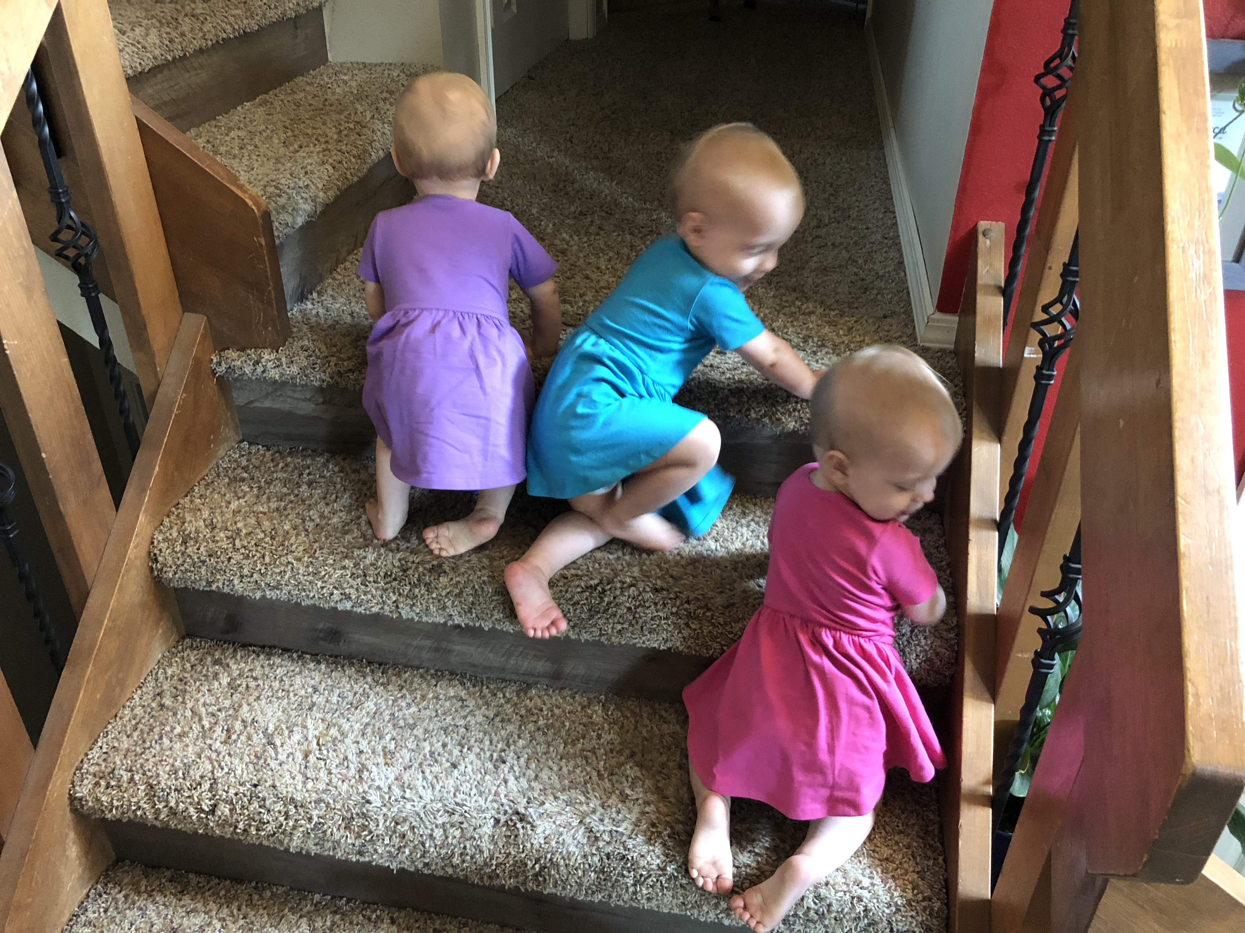 How to you manage to keep three toddlers from injury? Well, you don’t…at some point they will understand it, and for now we just try to keep the bonks to a minimum. Harper seems to hit her head on the table edge, or anything equivalent to her height really, while Reagan more often gets bumps from moving quickly and Emerie from climbing on things. Everyone is quickly learning how to go down the stairs too (safely).
