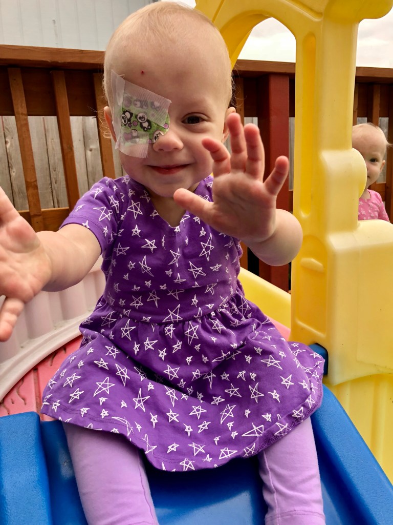 Emerie still has mild redness in her eye from last month’s surgery, although it continues to improve and is now less irritating for her. The doctor told us this week it is healing up nicely, but that her eye tracking is not improving as much as we were hoping. That could indicate the need for a second surgery later this year to correct it, or optimistically it might improve in the next month or two; we’ll have to monitor it and see what happens. Her purple colored eyelid is mostly faded now and she’s back to those big, smiling eyes. She’s also patching more easily and will soon have glasses!