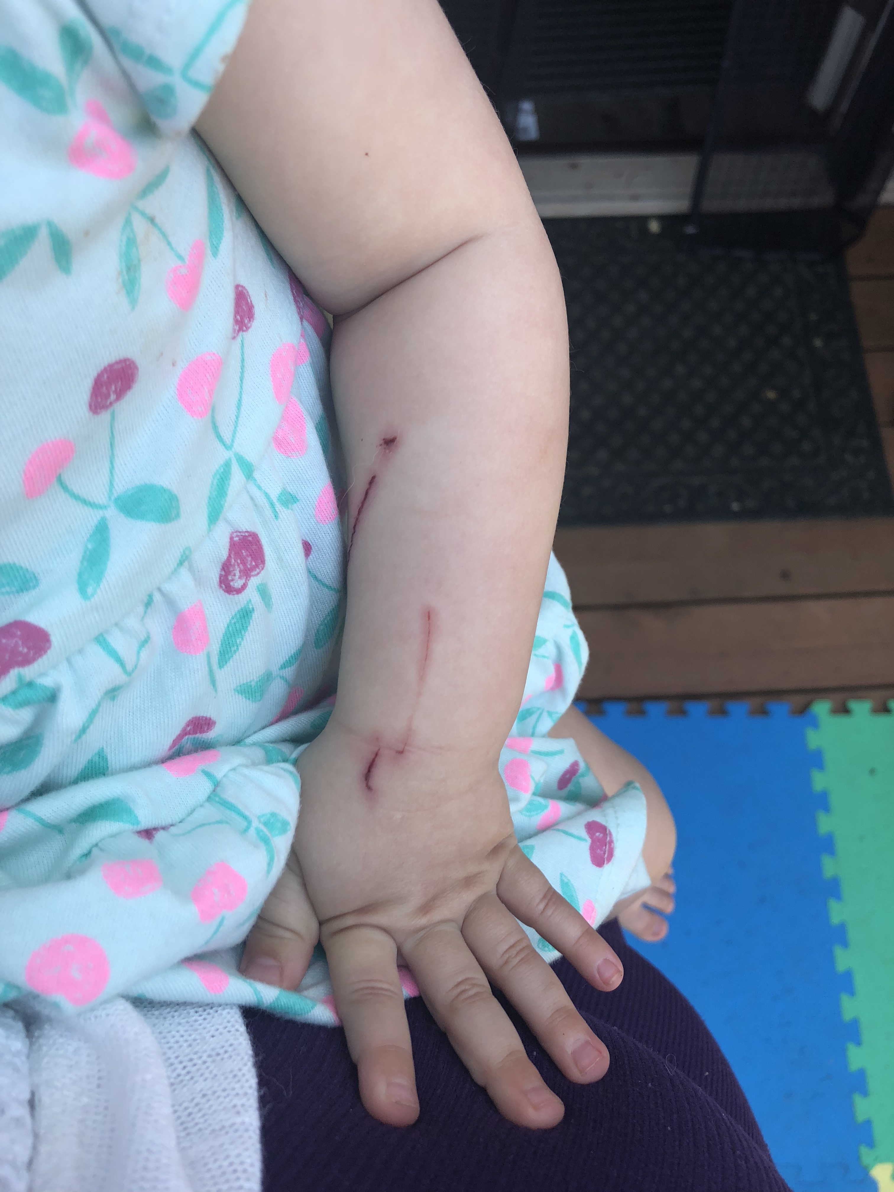 Reagan’s left arm has almost healed scratches from the dog versus cat tussle last week, where she happened to be in the wrong spot at the wrong time. Luckily they weren’t too deep, although it looks pretty terrible and scabbed over quickly. I’m pretty sure I took it worse than she did; that is a mother’s right, isn’t it? I’m sure it’s only the first of future tumbles and bumps and bruises as we navigate toddler hood full throttle ahead!