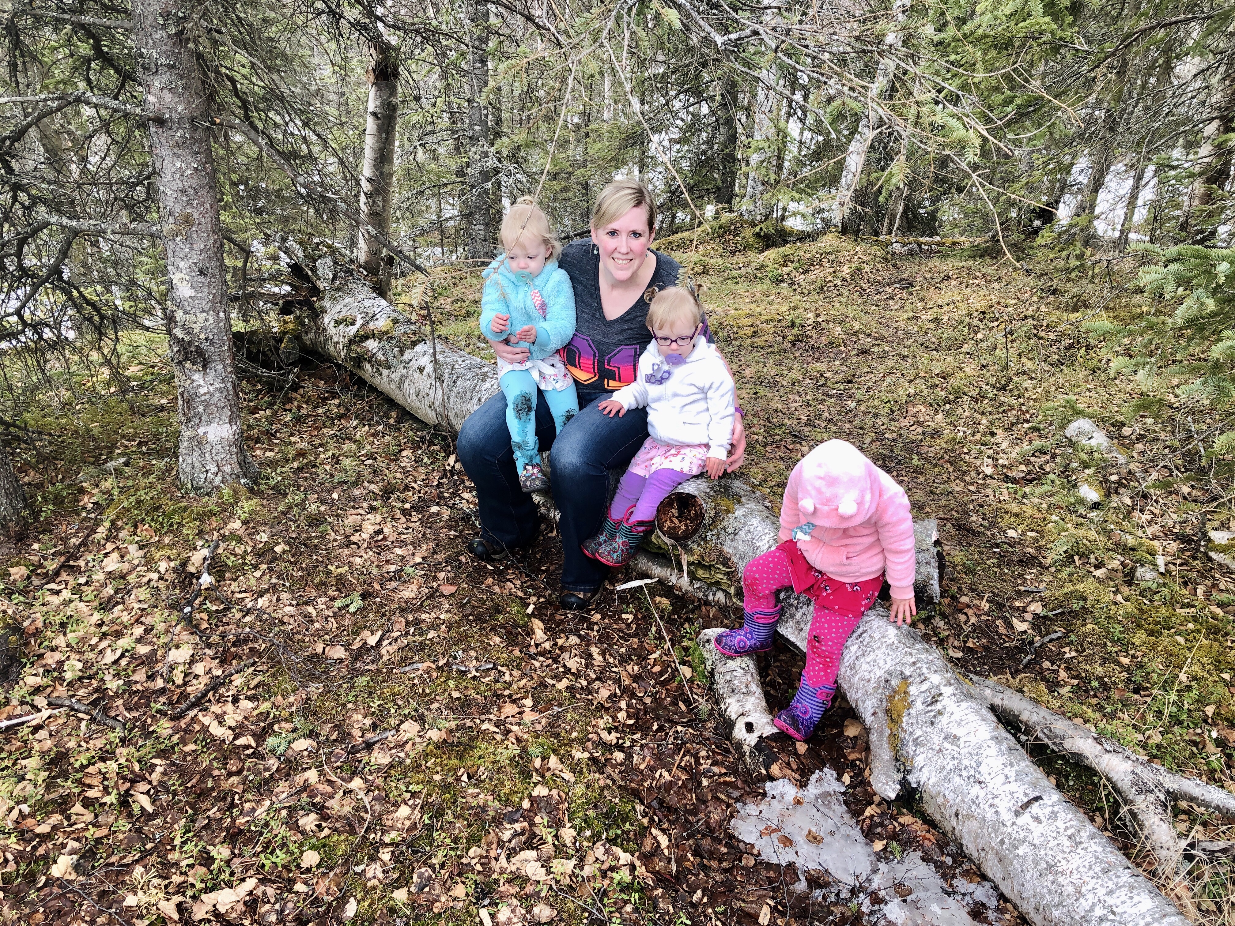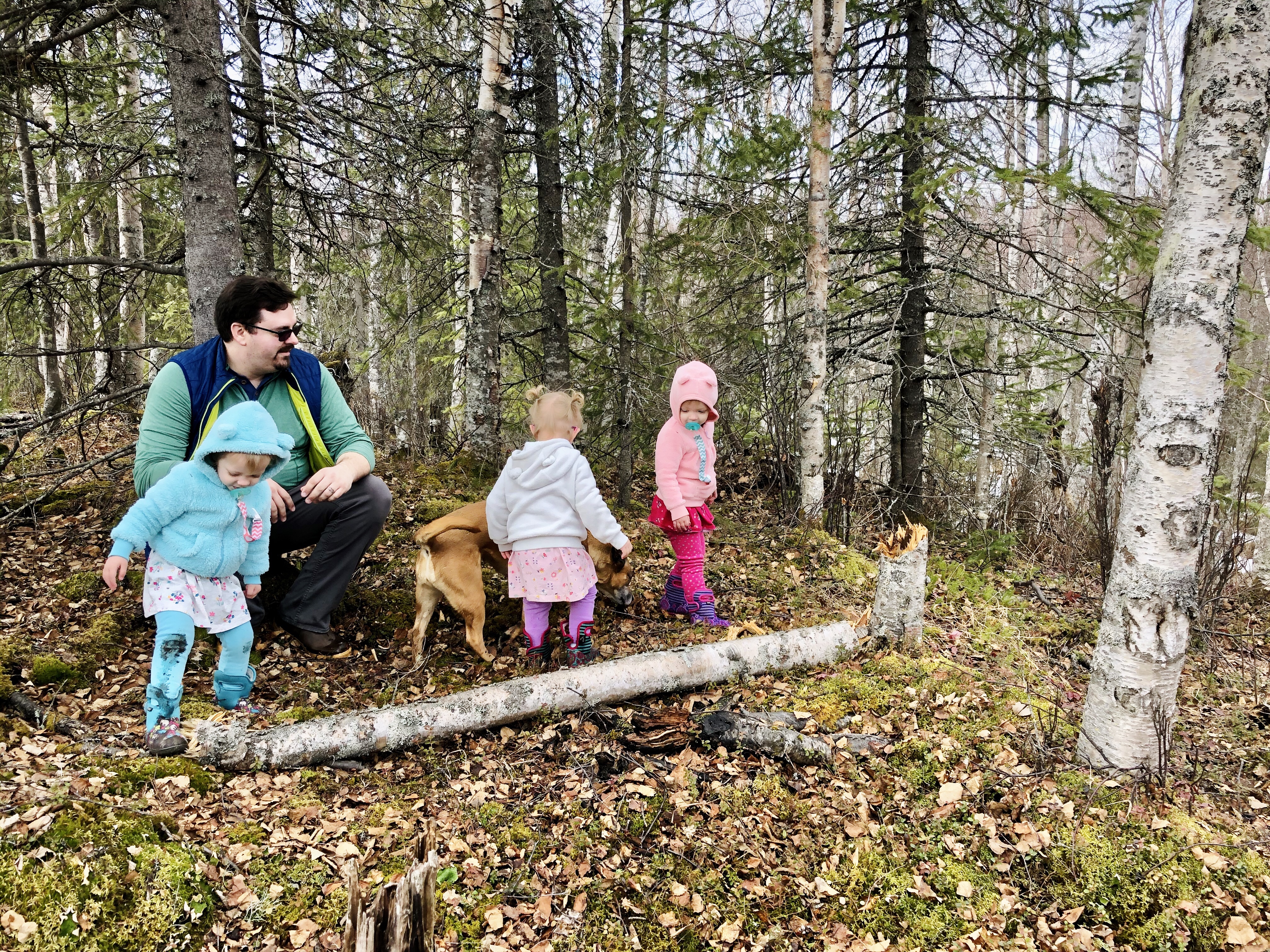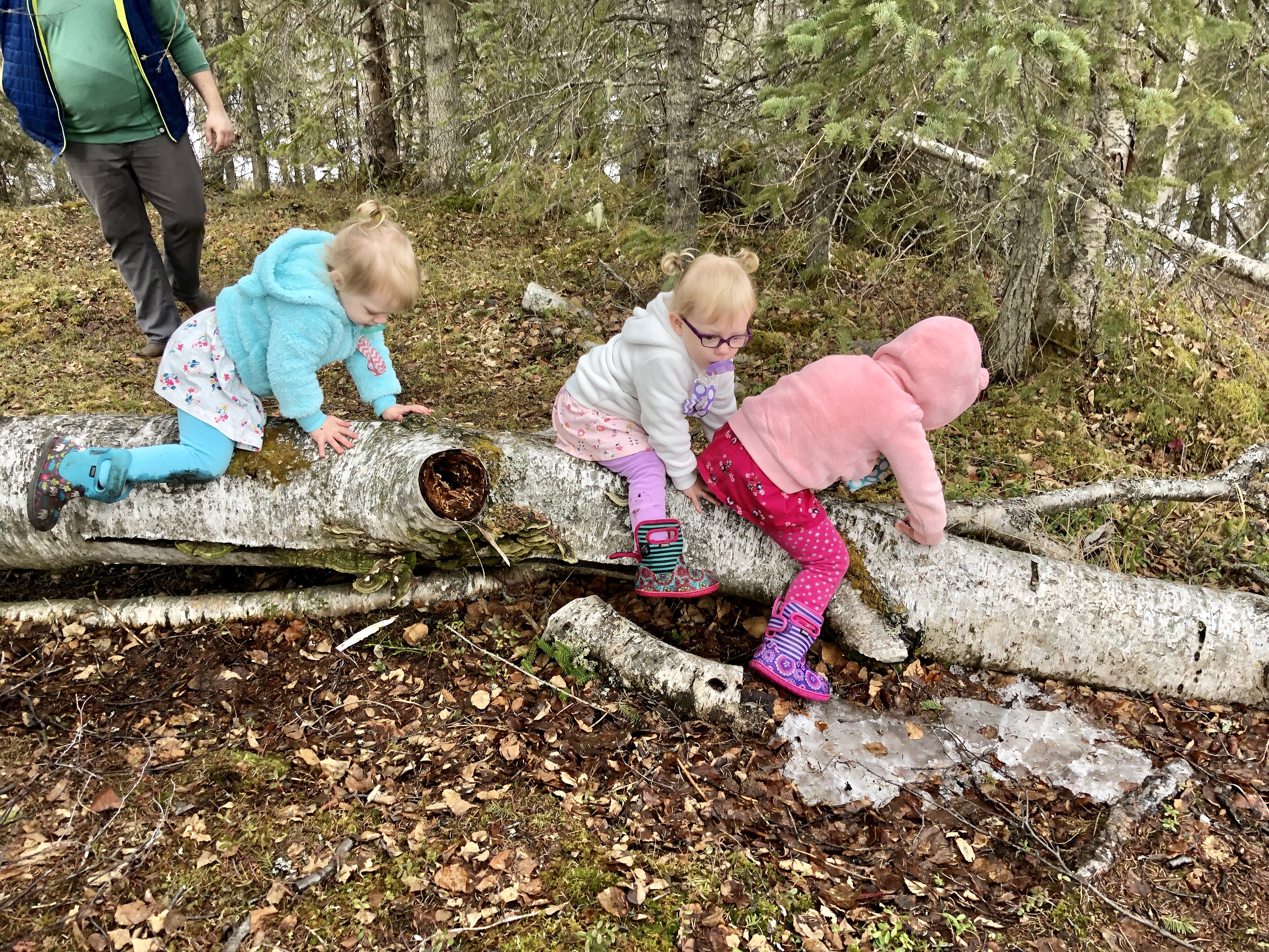 At some point we will again be out and about in society. To prepare for this monumental day, that will happen eventually although maybe not soon, we have introduced hand holding. They will not, under any circumstance, hold each others’ hands yet, but they are learning the benefits of holding onto an adult. It allows more freedom to explore and go places they ordinarily aren’t allowed to go. This includes going out the front door and down the steps to the driveway, upstairs, and out into the woods for adventure! Harper dislikes the control the most, but will begrudgingly do it with some insistence. Emerie loves it all the time and especially when going down any type of stairs or out into the world. She also commands you with hand! and then grabs yours and pulls you where she wants to go. Reagan mostly enjoys hand holding while playing or when in a new place. And that leads us to our first hike of the season.