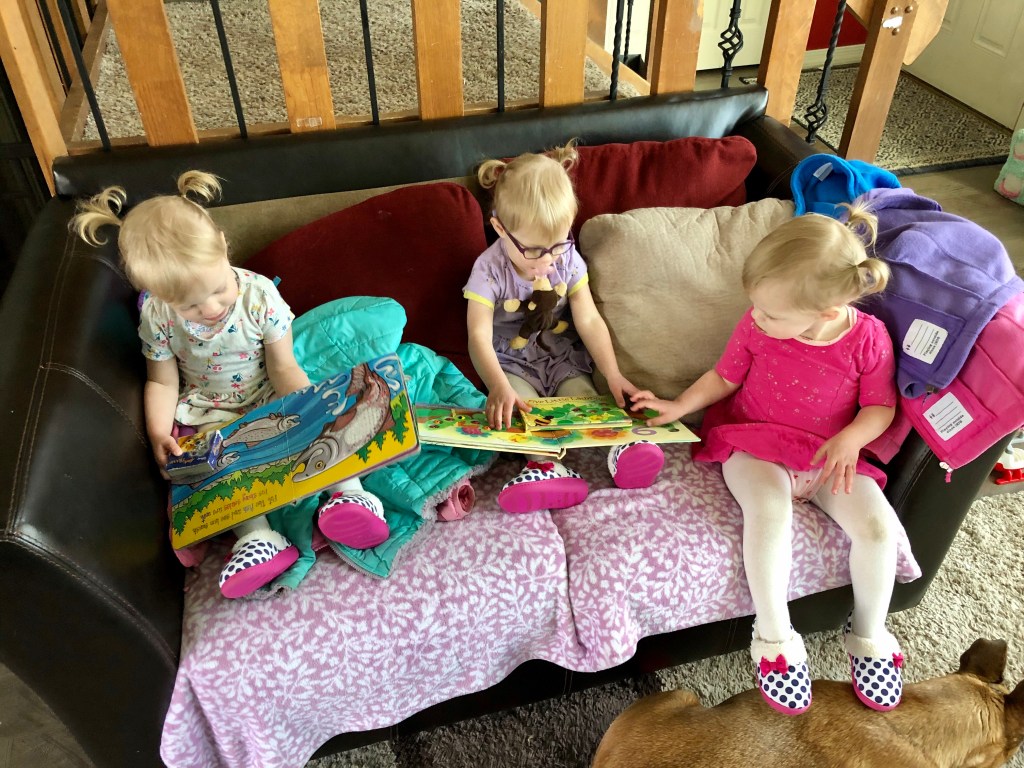 Clothing continues to be another bain in our existence. While no one wants to wear clothes (we are still using those 24 month bodysuits!), they all have explicit opinions on what they should wear and when. This includes hats, coats, boots and the occasional set of mittens that no one would wear when it was cold out! We cannot go outside without everyone requesting their hats and digging them out of the hat drawer, the same goes for coats. It is so wonderful that they now grab coats, hats, and boots without us having to get them. Whoever gets to the bins first will bring their sisters their things and hand deliver parents’ clothing as well! Now if we could just get them to keep all of that on when outside…I think this summer will consist of minimal clothing during backyard time. We also broke out the new sandals (trying to make summer get here); everyone can put them on and mostly unbuckle the Velcro.