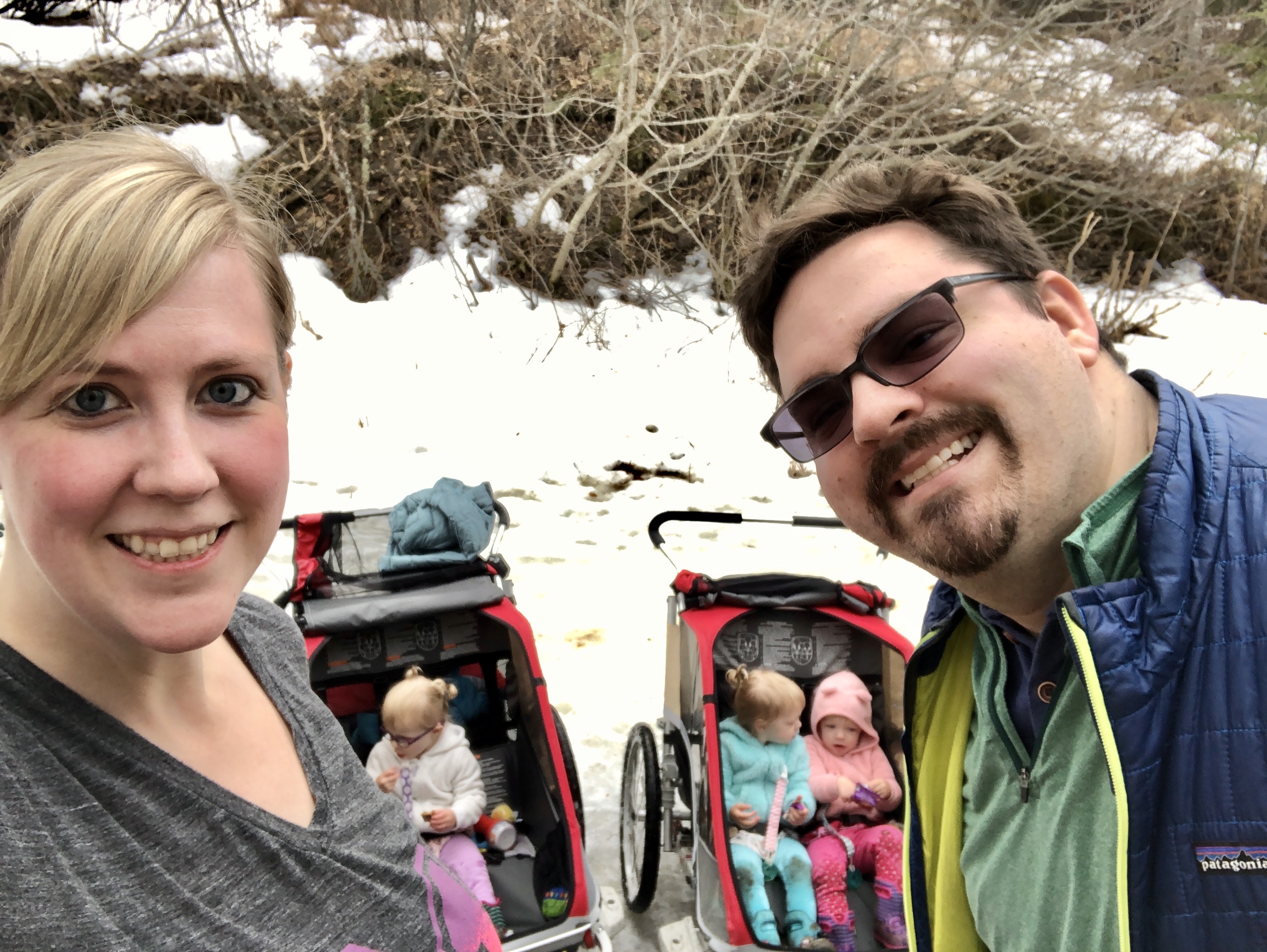 Last weekend we took the girls to one of our favorite spots up the mountainside in town, a place we used to consistently hike every week before kiddos and have visited less than a handful of times since. My assumption that the trail would be back to dirt was incorrect; the snow was very slushy and incredibly difficult to push a stroller through. We didn’t go as far as we planned to; we planned to free them to play in the creek but we didn’t make it that far. Instead, we turned around early and found a good spot to let everyone roam free in the less snowy areas. The girls climbed over logs, splashed in puddles, and checked out rocks, sticks and leaves. They did very well but definitely wanted parents to stay closeby and hold hands. I can already tell they will be outdoorsy, like their parents, and definitely plan to do a lot more hiking now that they are bigger. It’s also the perfect activity during a quarantine. Social distancing by miles!