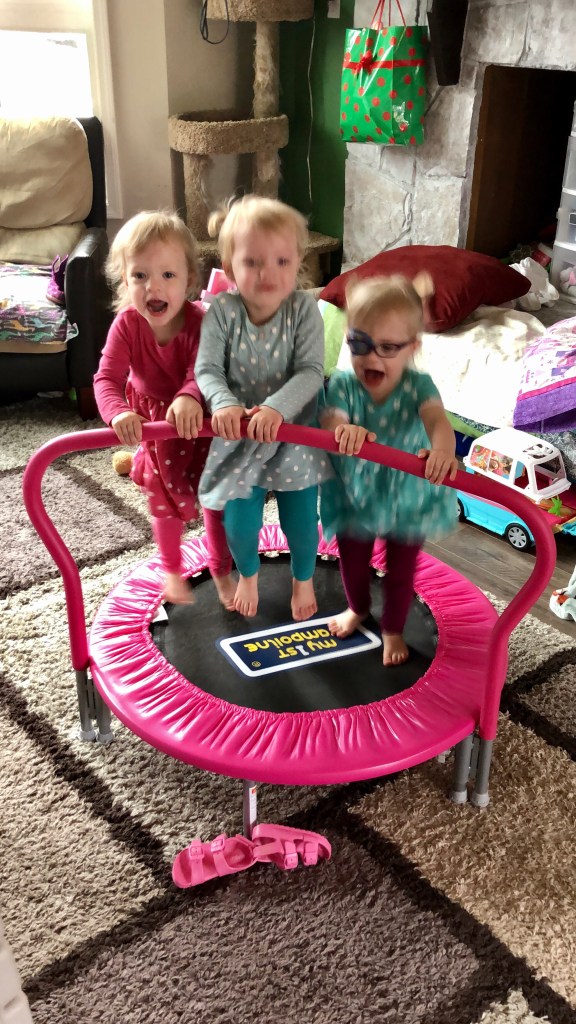 The toddler trampoline from Papa Cliff made it’s first appearance this week and all three jumped and giggled and smiled and then started to fight over it. While three little bodies can fit on it simultaneously, two is much preferred and they think one at a time, much to the dismay of other two. We are working on this, but I can tell this will be a great way to burn energy until the local jump park reopens.