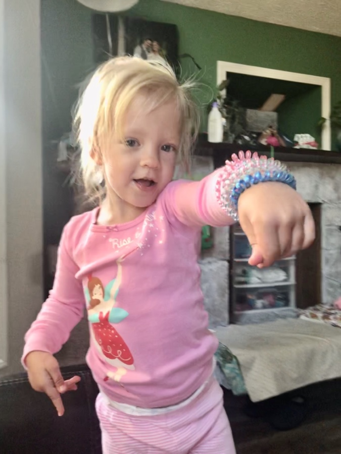 Lastly, the other morning I watched Harper put her coat on entirely by herself and was quite impressed. She laid it on the floor with the hood at the top, put both arms in the sleeves, stood up and pulled it over her head to her back. I imagine this must be something from daycare, but still. Genius right here! She is also the jewelry wearer and almost always has a bracelet (or five) on. This was Emerie for a time but has moved over to Harper enjoying the fancy style.