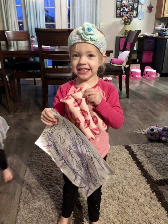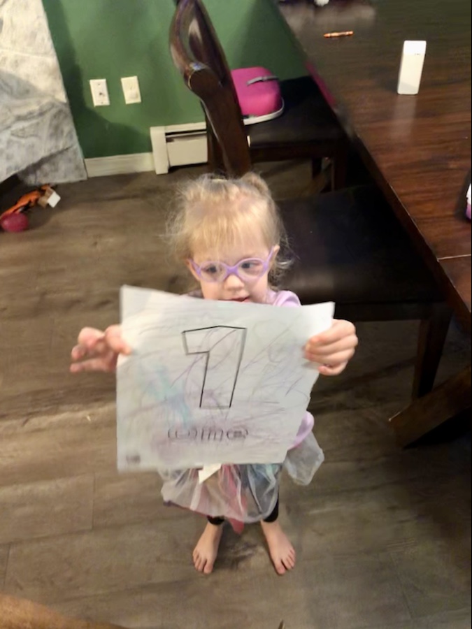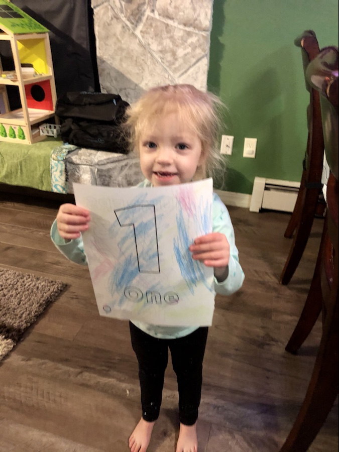 In addition to our artwork, letters and numbers, we are working on learning names. The girls have each others’ names memorized, including middle names, and will also tell you both mine and Craig’s. What’s cute is they never say “Craig;” it is always “daddy’s name is Craig.” Whereas mine is just Becca…not to be confused with the teacher Rebecca, so I differentiate that a lot. They also ask us to remind them Grandma Sue and Anne and Papa Cliff and Lon’s names and they are getting increasingly good at them. They randomly asked for Koda’s name too…which is pretty funny since it’s, well, Koda.