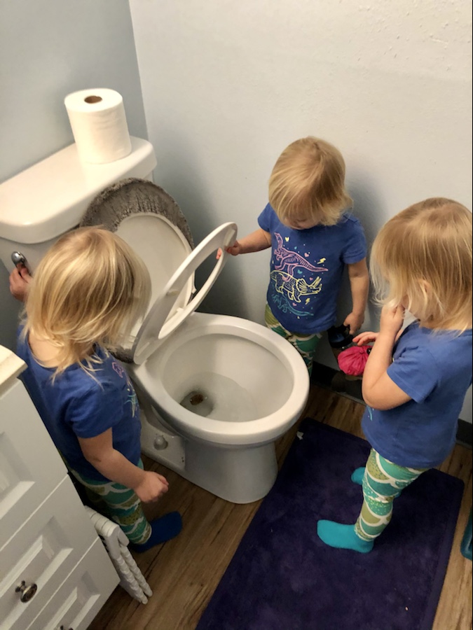 Number two was a little more (or a lot more) effort, especially when it comes to three. They have moments of all collaborating and going at the same time in their undies, and then insisted on tagging along together for the bathroom experience, which can take forever. Who knew how tight a half-bath could feel when you have one adult and three children together! It often seems if one had an accident, for whatever reason the others follow suit, even when we know they recently went. I’m not sure if that is a multiples thing or just kids being kids thing, but they still do it even now.