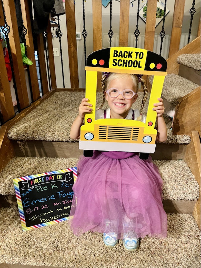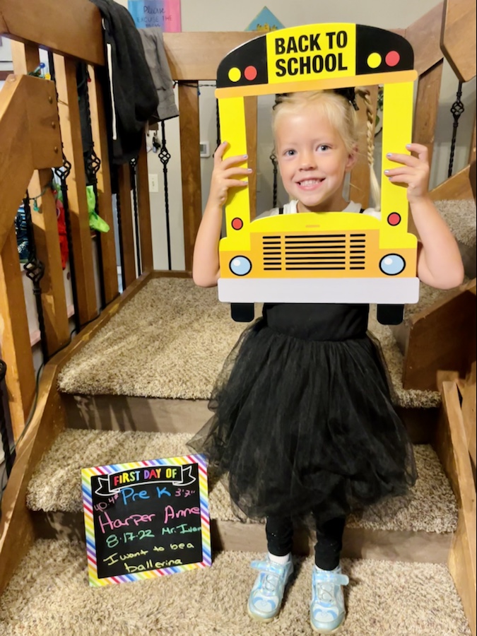 Each kiddo happily snapped a few photos for me with the back-to-school bus board and their customized board. In honor of the milestone everyone was measured for updated height and weights: