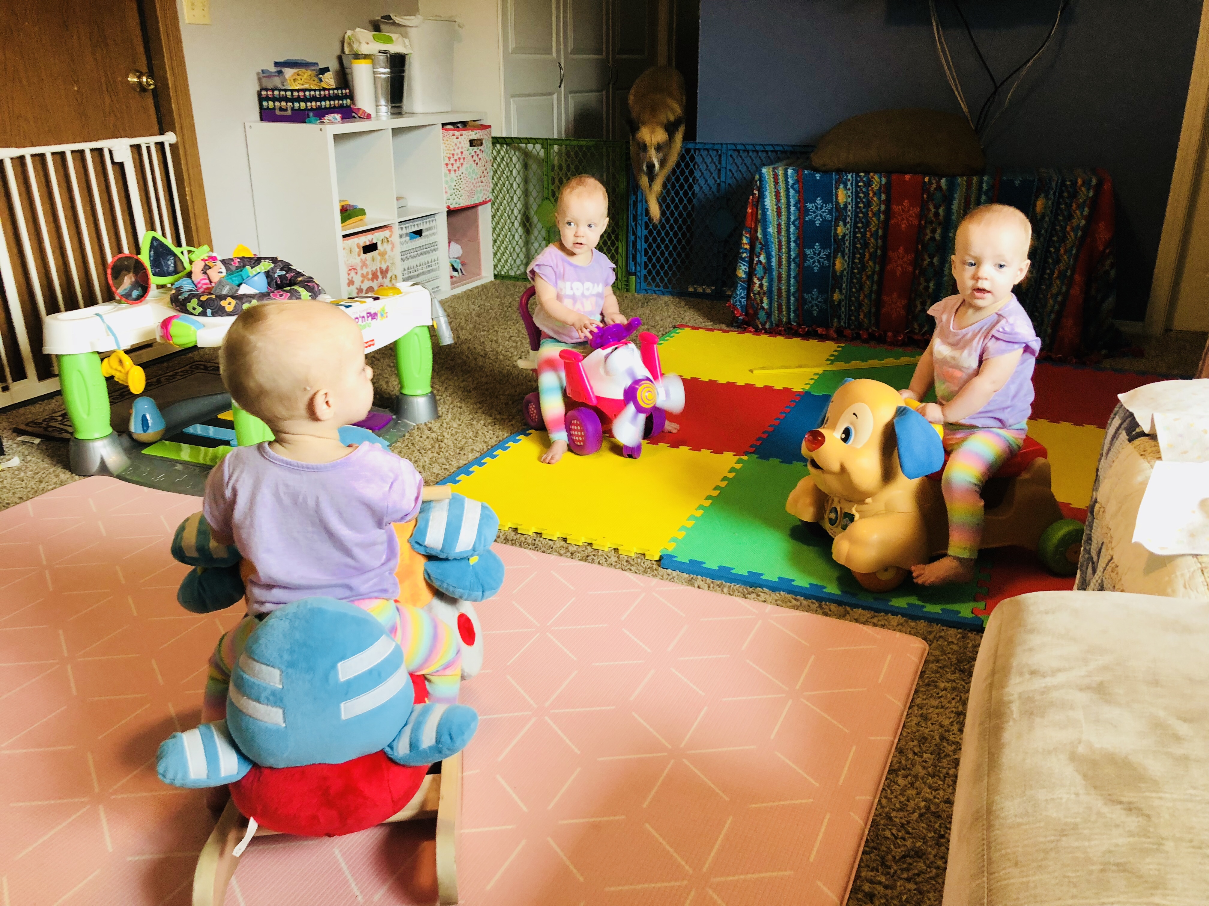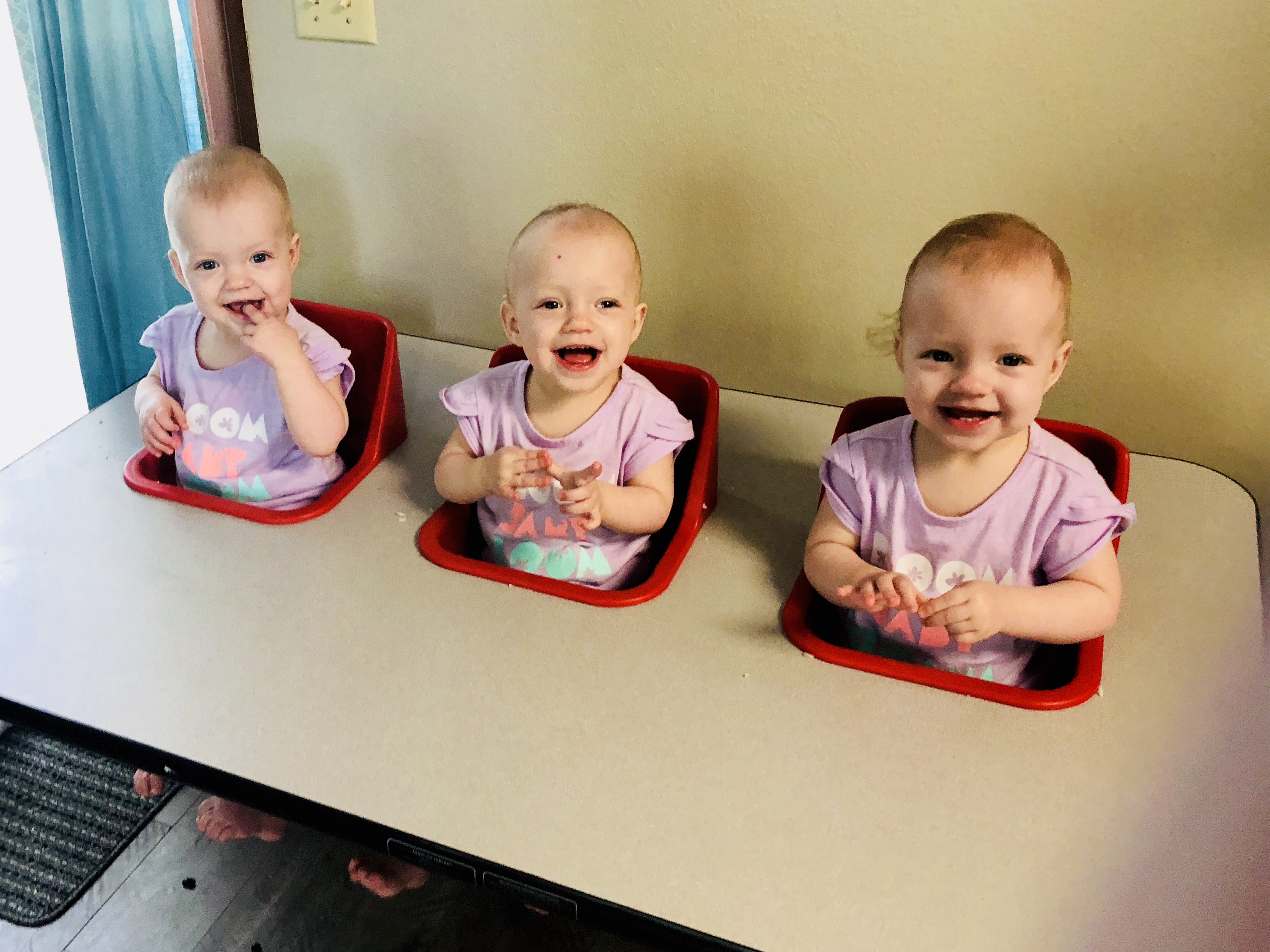 As we increase food intake we are finding that they still want a decent amount of milk. In fact, on many occasions they will casually eat food but then insist on a bottle afterwards, especially Harper and Emerie. Reagan is a little less bottle enthusiastic than her sisters but I also think she is distracted by all the fun things she could do instead of eat!