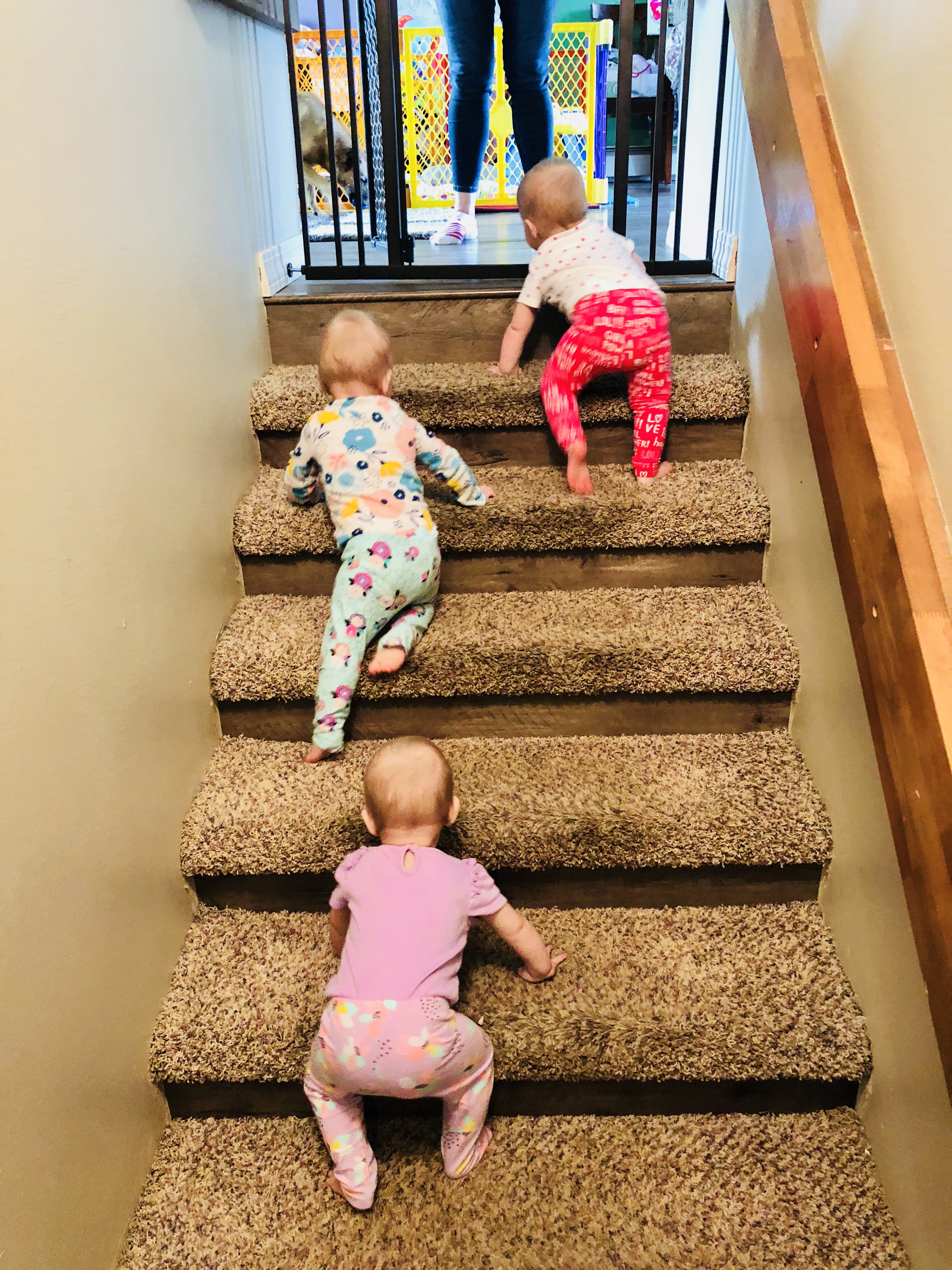 Remember when everyone’s first love was the ceiling fan? This discovery was about a year ago and lasted far into 2018. The fan is now replaced with window/door curtains. This past weekend we opened up the living room, taking part of the baby prison wall for a few minutes each afternoon so they could all wander. This was quite the hit and the curtains were discovered to be amazing. Everyone played in the dog water bowl (before we put it outside), and enjoy standing at the back door, balking at the dogs and playing peek-a-boo with the curtains. The kitchen is also fair game. For the moment we are enjoying they do not understand how to open the cabinet doors.