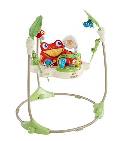 Our favorite jumper of the three is the Fisher Price Rainforest Jumperoo. It was by far the girls’ favorite one and used for hours over a couple of months. So much happiness and giggles!
