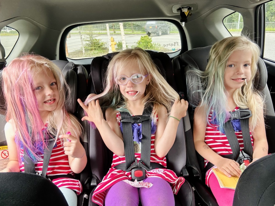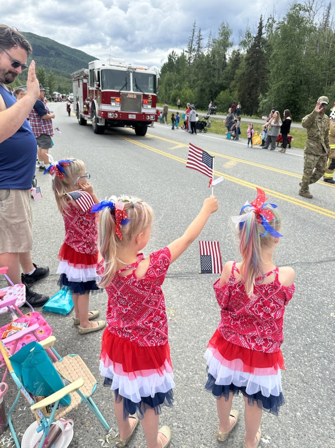 Fourth of July weekend was uneventful overall and we mostly stayed close to home. The girls rode bikes and played outside, did some crafts and we watched them disassemble their new Lego sets. For some reason they refuse to let any of the Lego figurines keep their hair and we continue to find those pieces all over the place. Pretty sure I will glue those in place before we permanently lose them. We spent the afternoon of July 4th out in Chugiak, about 20 minutes out of town, at the holiday parade, with great seats right along the roadway. The girls did not appreciate the police and fire sirens ten feet from them, but otherwise enjoyed waving flags and demanding candy from the brigade passing by. Reagan was especially excited over the vintage teal colored cars that went by while Emerie was much more enthusiastic about picking ALL the flowers in the right-of-way and “making” fireworks with them, and Harper just wanted to snuggle and eat snacks on my lap. At one point one of the homeowners shot off a couple fireworks and all three jumped out of their skin and ran to us. Clearly we’ve never been that close to loud fireworks, since last new years we didn’t successfully keep them outside to see them.