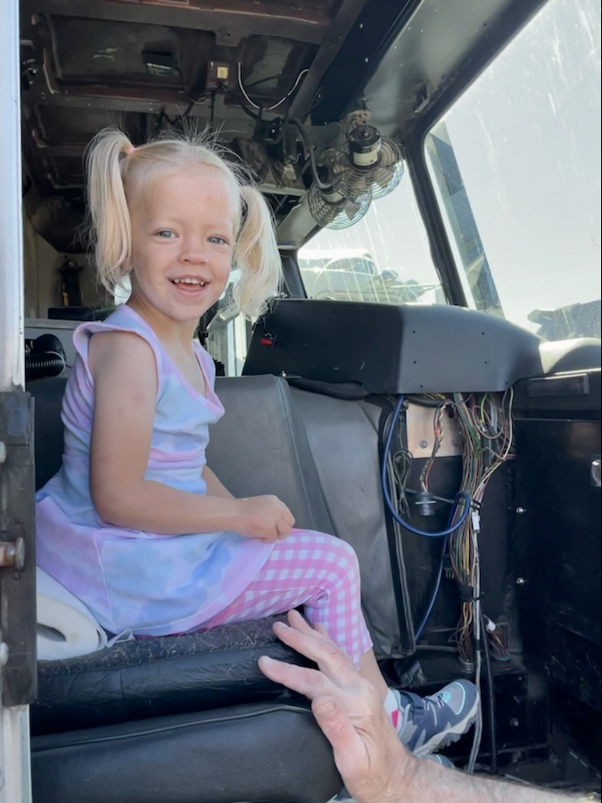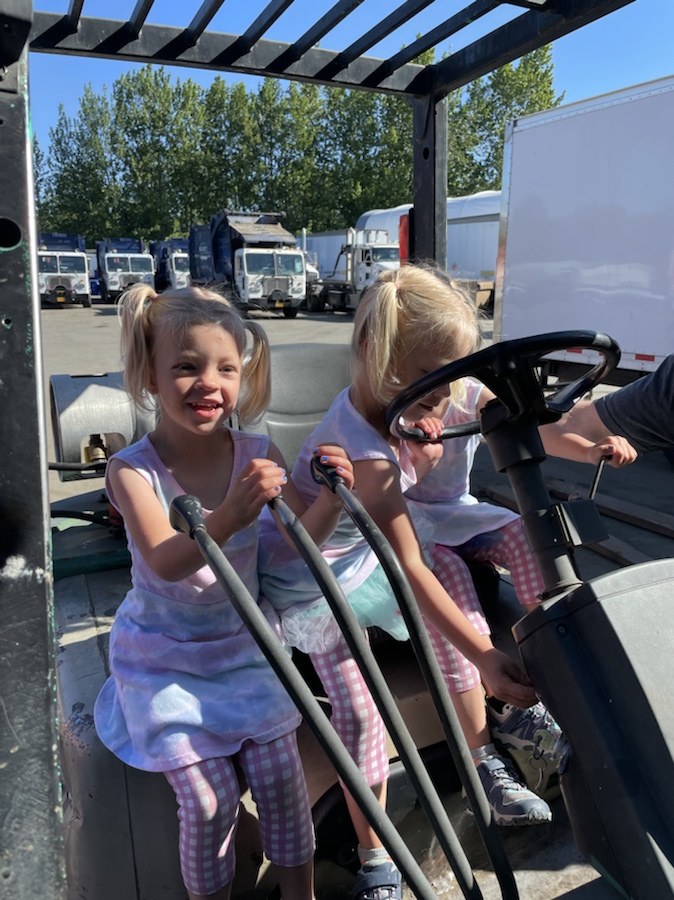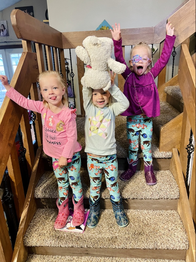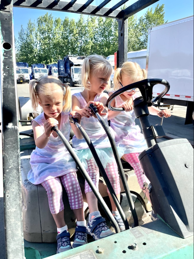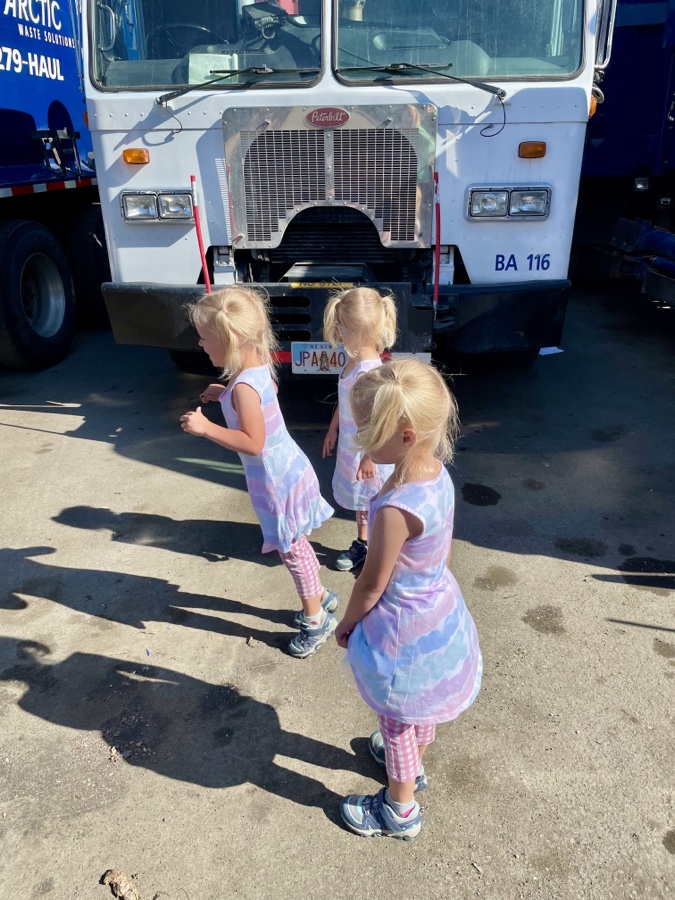 The girls enjoyed riding on the pull behind trailer that could fit all the kids and two adults without getting stuck! A few joy rides were given and a circle track made- a loop the kids ended up chasing one another around on for a good amount of time. Emerie favored the rides the least (she appears to be more hesitant like me on some of the craziness) while Harper and Reagan enjoyed the bouncing and speed. They also played in the “poop hole,” as the men coined it; and could impressively climb out of it like nobody’s business. It’s handy to use the chest of a fellow sibling as leverage to push oneself up…I’m sure there are some fun toys buried in there for someone in the future to find.