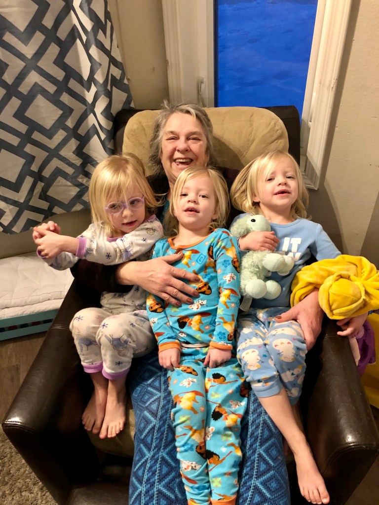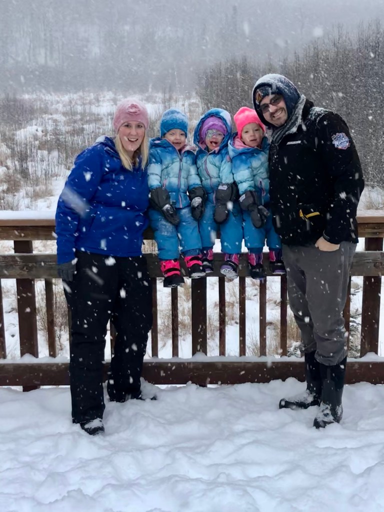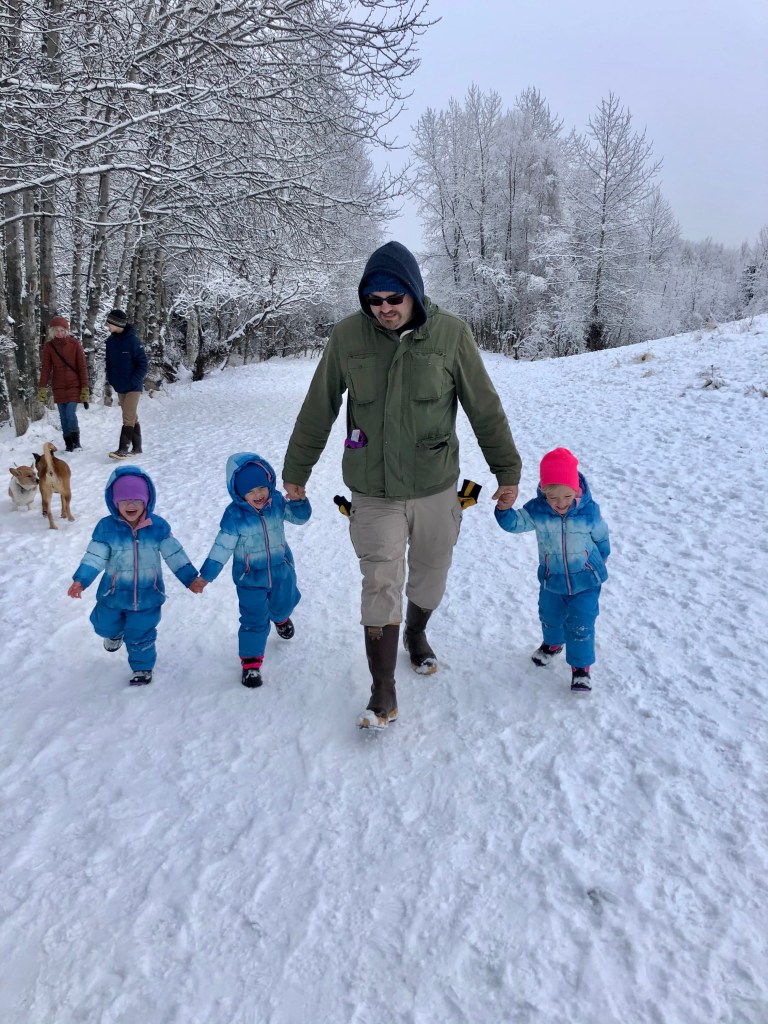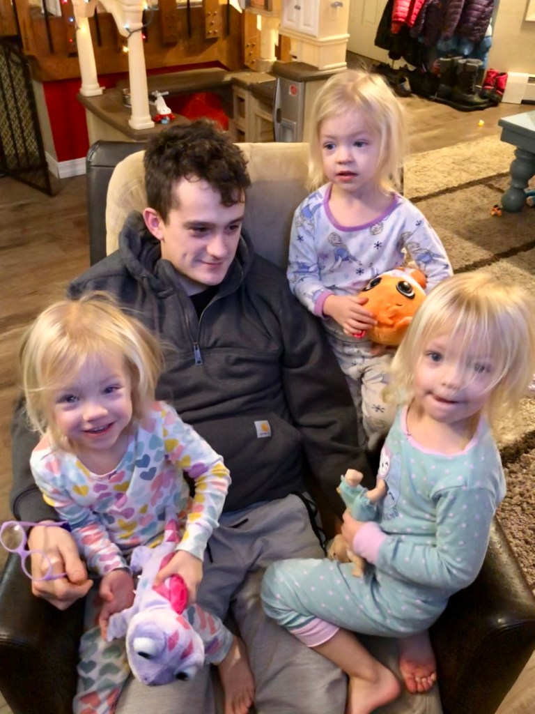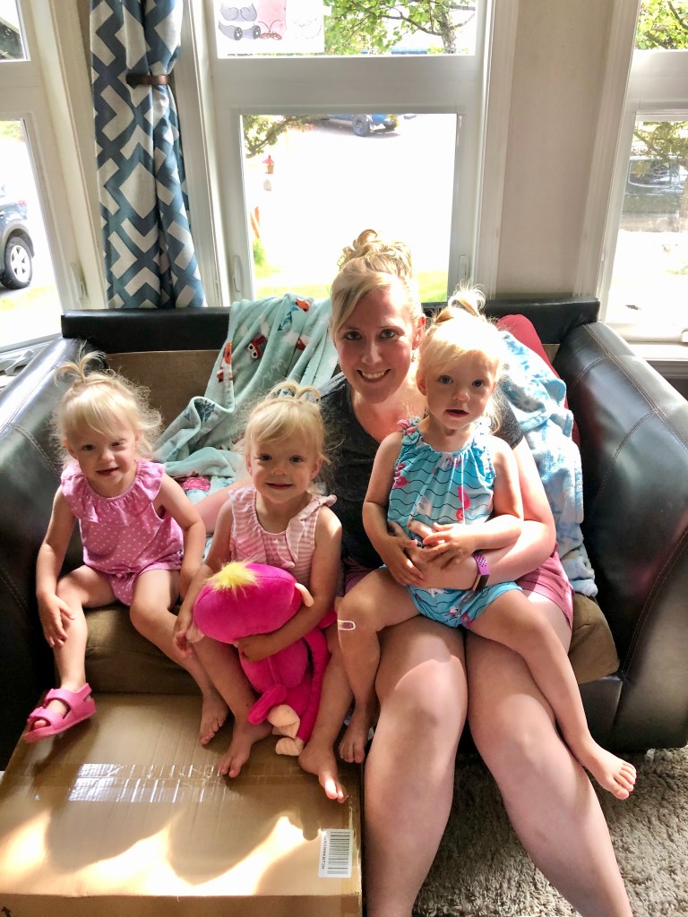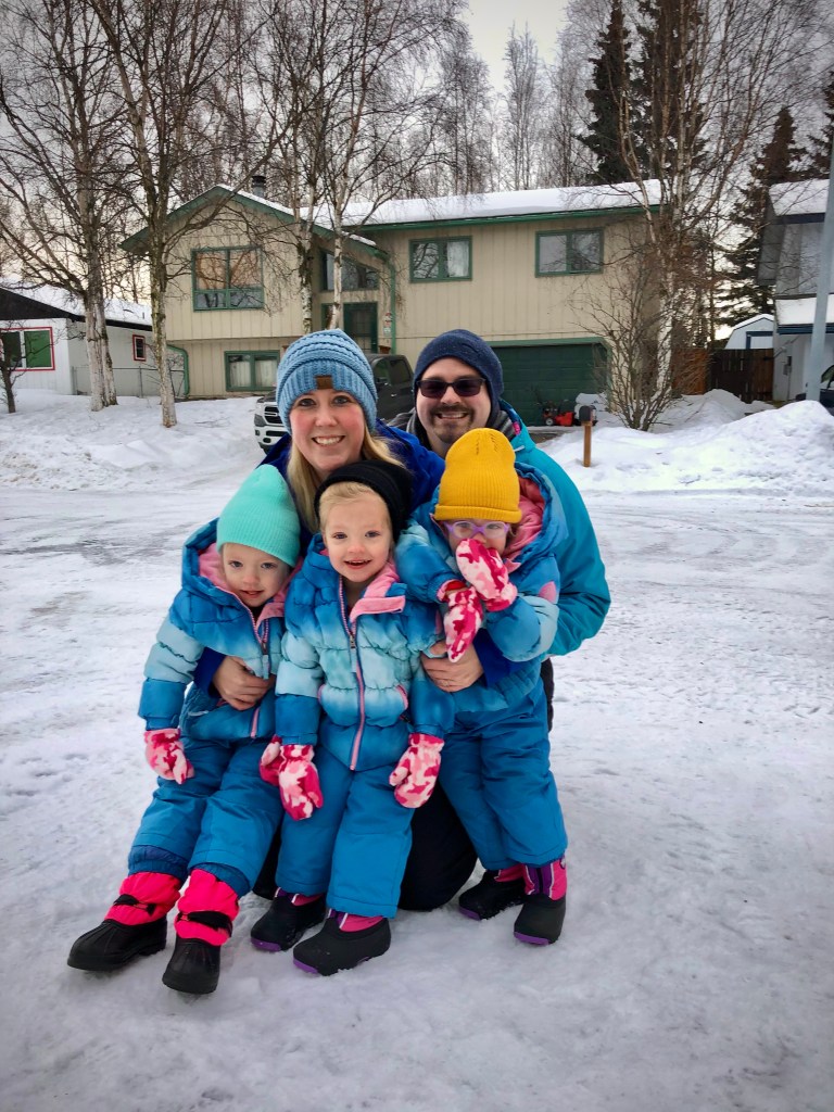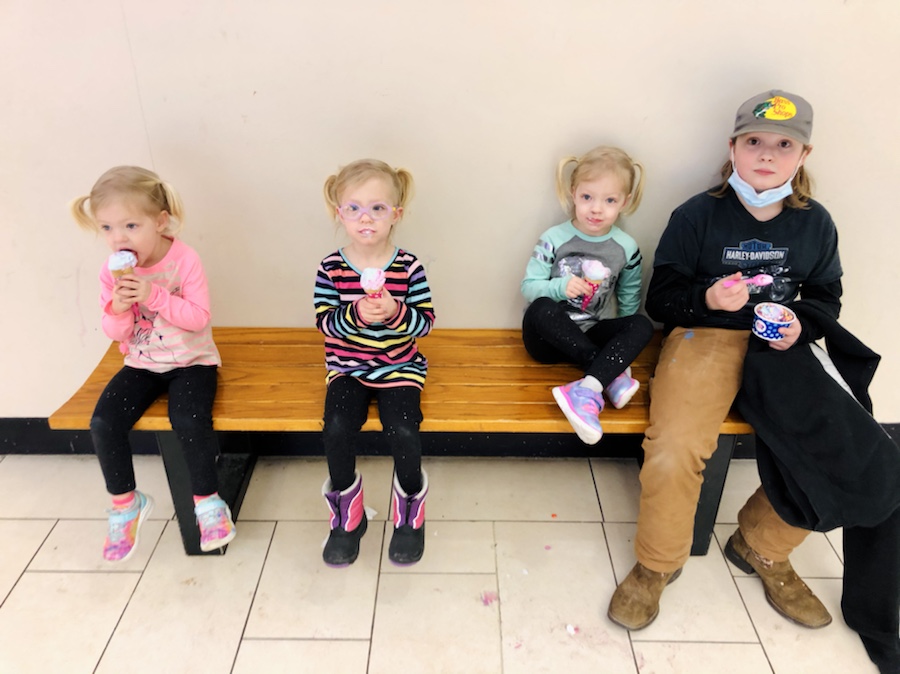 But not everything is different- of course there are also similarities to raising three of the same age at the same time. Everyone likes to sit in the middle car seat and fight over it, with Emerie the best behaved of the three during rides around town. Favored activities include the trampoline park, sledding, playgrounds, neighborhood walks, swinging (yes it needs its own category), baking, play dough, arts and crafts, anything with buckets and scoopers and pretend play. Everyone loves to play in the bathtub and make a huge mess on the bathroom floor. They all LOVE trash truck and snowplow visits, seeing forklifts at the store and helping hold things in a shopping cart. Moose sightings are a huge deal and worth talking about for days. Everyone loves their designated colors and fully believes they should never have to share something that is “their” color, including silverware and dishware, clothing and any type of toy/stuff animal that is pink/purple/teal. All three love to FaceTime with family and hold the phone themselves, hogging it as much as the parents will allow and running off with it to hide.