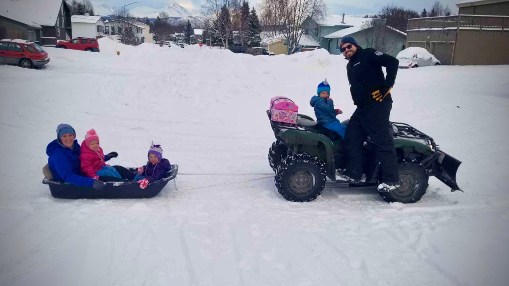 When we first overcame the fear of the loud four wheeler, everyone fought over sitting on Daddy’s lap for an excursion around the neighborhood. Now Emerie prefers sitting backwards on the sled and look at me while Harper and Reagan both like to “drive.” Harper discovered it’s fun to sit on an adults lap on the back of the actual four wheeler and look out too.