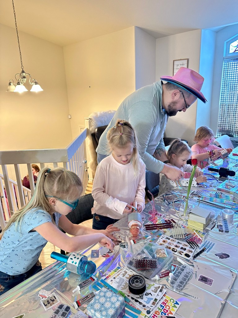 Birthday Parties Galor: School age brings a newfound plan several weekends a month…birthday parties. These are important life events that the kids demand to attend and who knew that we knew so many kids that have birthdays?? This photo is, of course, Craig supporting the craft time at a Taylor Swift themed party, with the girls bejeweling their custom microphones. Girl dad for the win.