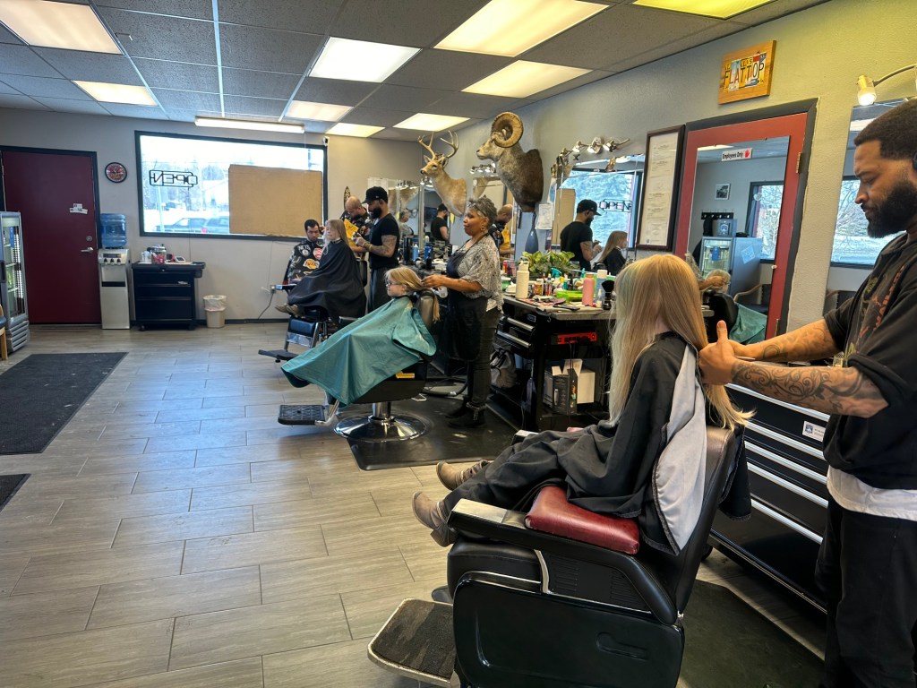 Speaking of hair cutting, one to-do for spring break week was a triple hair trimming to cut off those ends. Because I absolutely refuse to go to the places that charge crazy amounts for a kid haircut, we wandered over to Craig’s barber again and asked for a trim. Middle of the day in the middle of the work week is apparently a good time, and all three went at the same time; that and no one wanted to go first! They all sat very still, with Harper and Emerie making their normal goofy faces at us, and Reagan’s bangs were trimmed to be a bit more acceptable. A set of identical twins actually cut two of them, which was very random and spurred some conversation. I also realized their super blonde, baby hair is already down to the bottom trimmed area, and the majority of their hair is now a darker blonde, which makes me a little sad but I’ll survive ๐