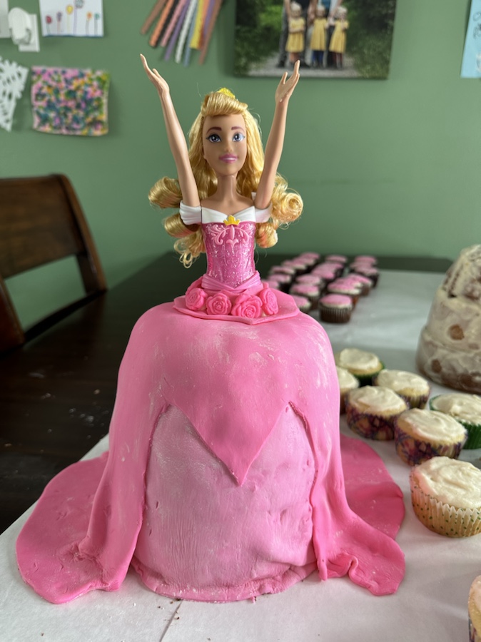 Sue spent a good afternoon making the cake stacks for the main part of each dress. We ended up using a small bunt cake pan and a round cake pan and the girls had the pleasure of jamming, and I mean jamming, the dolls into the partial holes. I volunteered to cut the feet off each to fit better, but Sue wouldn’t let me…you know…that might bring up those traumatic life memories of poor Gecko the chicken last year, when he lost his head and then he lost his feet. No, we didn’t shove him in a cake….but tough times remember by all!
