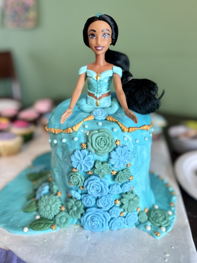 We completed the look by adding pink, purple and teal fondant to the chocolate (for Harper) and vanilla (for Emerie and Reagan) cupcakes and used the remaining flowers and leaves to finish each with a treat on top. We also learned our lesson from last year and put icing under the big cakes so they wouldn’t slide during the car ride over. Well, not completely learned our lesson, since we forgot until cake number two to actually secure it down. The cupcakes around the dolls are meant to be the train of the dresses and colors inter-weaved with one another. Overall I think it turned out quite well, even with the random holes and fronts covered in flowers.