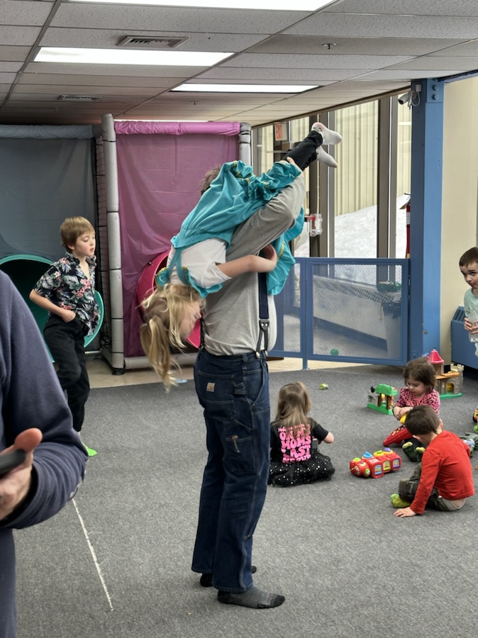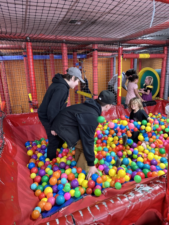 The kids ran around for a good ninety minutes in the play place, goofed off and played with cousins Tyler and Chatum and started ball pit wars, and snacked on Grandma Sue’s vegetable pizza and vege-platter. I also saw blurs of cousins Corbin and Elliot running and climbing, and finally put faces with names of their classmates and kids the girls talk about on the drive home each day. I caught Reagan snuggling with Aunt Janelle a few times, all three checked in and were thrilled to see Miss Tawni, Isabelle let Emerie borrow her Elsa wig to match her dress, Harper was a blur as she circled the play area over and over with her friends, and everyone lined up for a turn with the pinata, which made it through all the younger kids without breaking.
