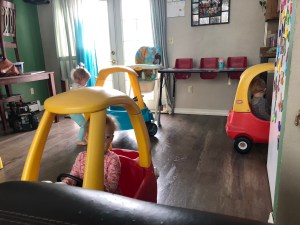 Bringing outdoor toys inside has been a must throughout this long and cold winter. We bring the cars in every month or so and let the girls create highways in the living room for a few days. These are not to be confused with the airplane, four wheeler, and tractor that also create new “venues” of fun within the house. It is always quite the hit; once they get bored with them, back outside they go for a few more weeks (ahem..the cars, not the girls…)