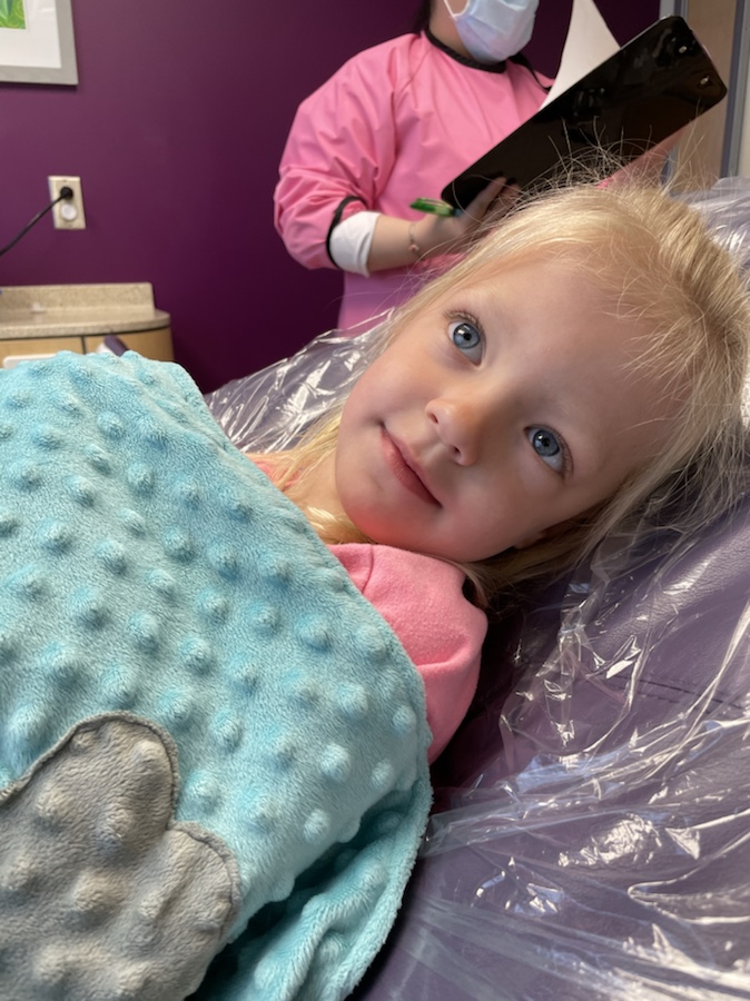 Harper was up first, needing two separate appointments for cavities on either side of her bottom molars. To my surprise, she was both excited and a little nervous—though mostly thrilled to have a medical appointment all to herself, without her sisters tagging along. The wonderful dental hygienist explained the entire procedure beforehand and even let her use the light for a tiny practice filling on her hand. That little blip became a prized possession- one I had to keep track of throughout the visit- and is now safely tucked away in the treasure box by her bed.