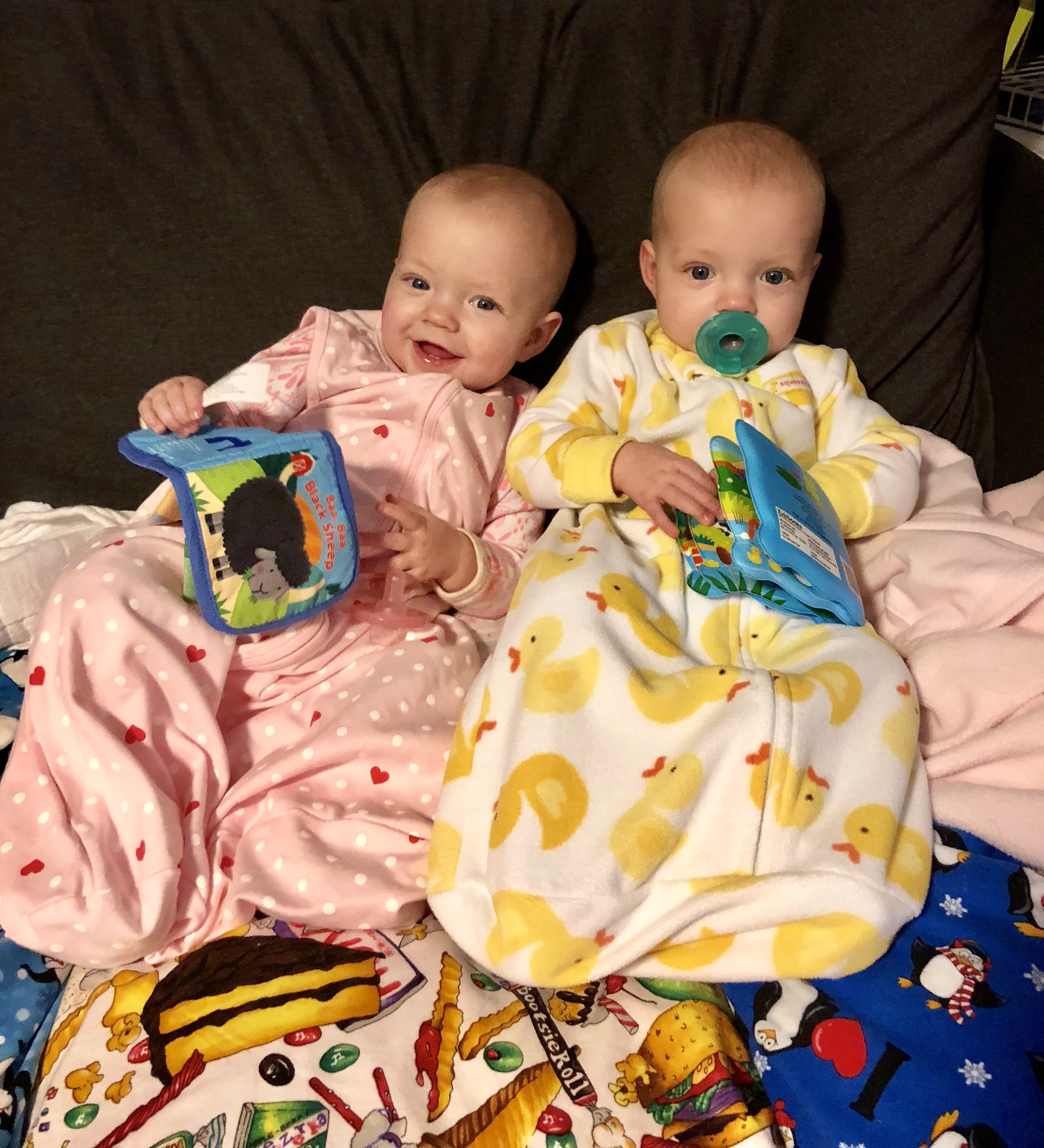 They also look ADORABLE when sleeping with their arms out. I think Harper might end up being a tummy sleeper (as long as she doesn’t realize it is like tummy time haha). Reagan is now our best sleeper and Emerie is still a work in progress but does go to sleep eventually!
