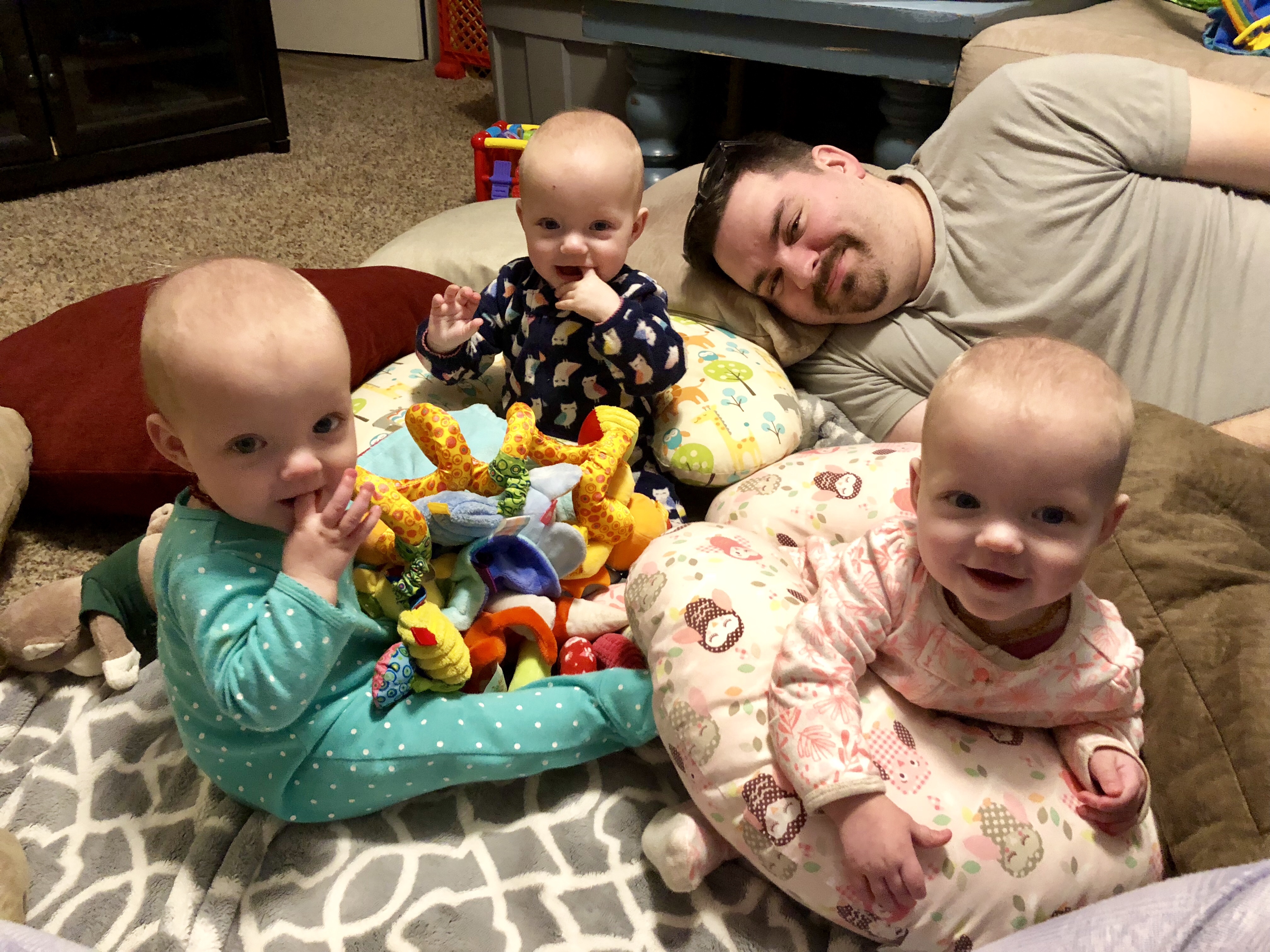Everyone is progressing at sitting up. We still use the boppies with all three to minimize the bumps and screaming. Overall, they are all pretty good at it and can turn onto their stomachs, reach for toys, and steal from each other.